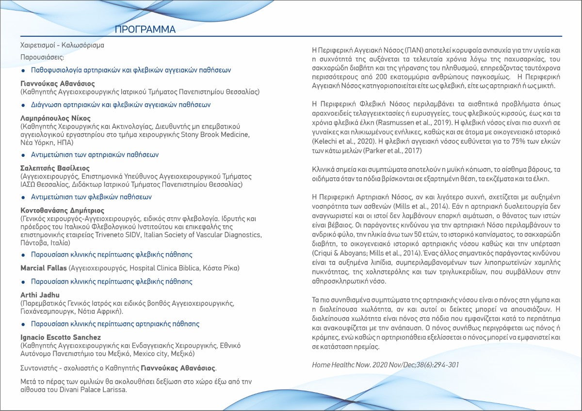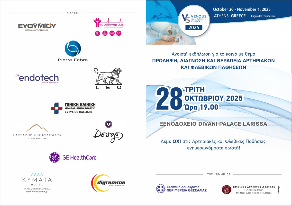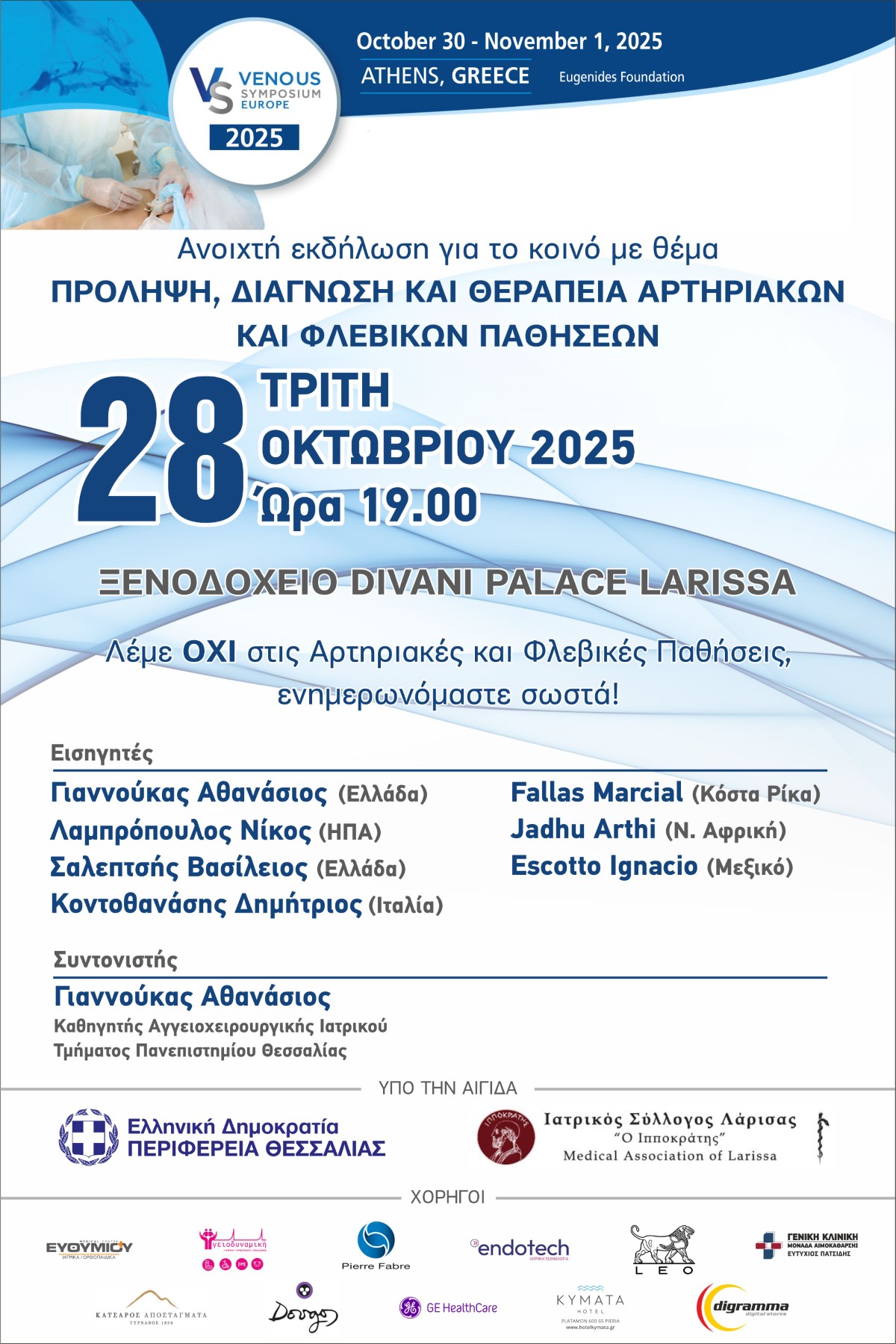 Στα πλαίσια του συνεδρίου Venous Symposium Europe που θα λάβει χώρα στην Αθήνα από 30/10-01/11/2025 και σε συνέχεια της περσινής επιτυχημένης διοργάνωσης της εκδήλωσης-ενημέρωσης για το κοινό με θέμα «Φλεβικές Παθήσεις – Αντιμετώπιση και Θεραπεία» που πραγματοποιήθηκε στις 15/10/2024 , σχεδιάσαμε σε συνεργασία με τους έγκριτους συναδέρφους Λαμπρόπουλο Νίκο και Κοντοθανάση Δημήτριο , μια νέα εκδήλωση ενημέρωσης-ευαισθητοποίησης στις 28/10/2025, ημέρα Τρίτη και ώρα 19.00 στην αίθουσα εκδηλώσεων του ξενοδοχείου Divani Palace Larissa , με θέμα «ΠΡΟΛΗΨΗ, ΔΙΑΓΝΩΣΗ ΚΑΙ ΘΕΡΑΠΕΙΑ ΑΡΤΗΡΙΑΚΩΝ ΚΑΙ ΦΛΕΒΙΚΩΝ ΠΑΘΗΣΕΩΝ».