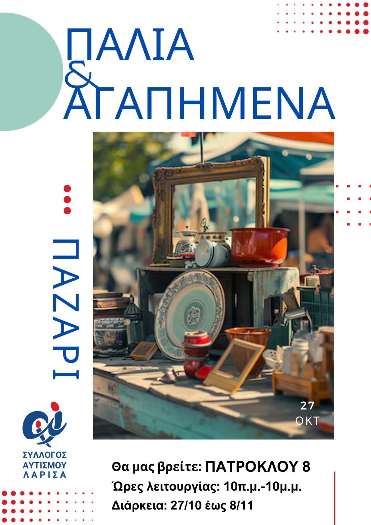 Η πιο αγαπημένη φθινοπωρινή γιορτή επιστρέφει με παλιά αντικείμενα σε νέες… περιπέτειες. Από τις 27 Οκτωβρίου έως τις 8 Νοεμβρίου, στην Πατρόκλου 8, το παζάρι «Παλιά & Αγαπημένα» που διοργανώνει κάθε χρόνο ο Σύλλογος Αυτισμού Λάρισας μας περιμένει με εκατοντάδες μοναδικούς θησαυρούς.