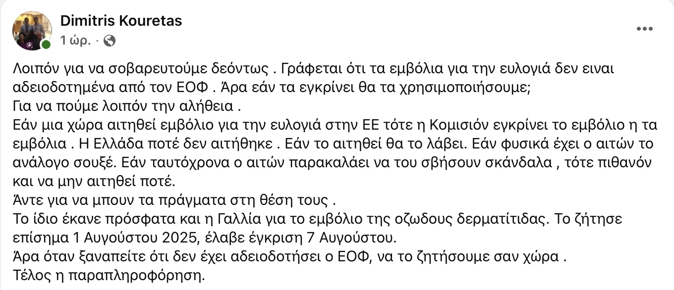 Ο κ. Κουρέτας ξεκινά την ανάρτησή του δηλώνοντας πως πρέπει «να σοβαρευτούμε δεόντως» και καταγγέλλει ότι κυκλοφορεί ψευδώς η πληροφορία πως τα εμβόλια για την ευλογιά δεν είναι αδειοδοτημένα από τον ΕΟΦ.