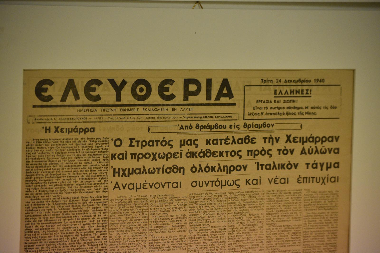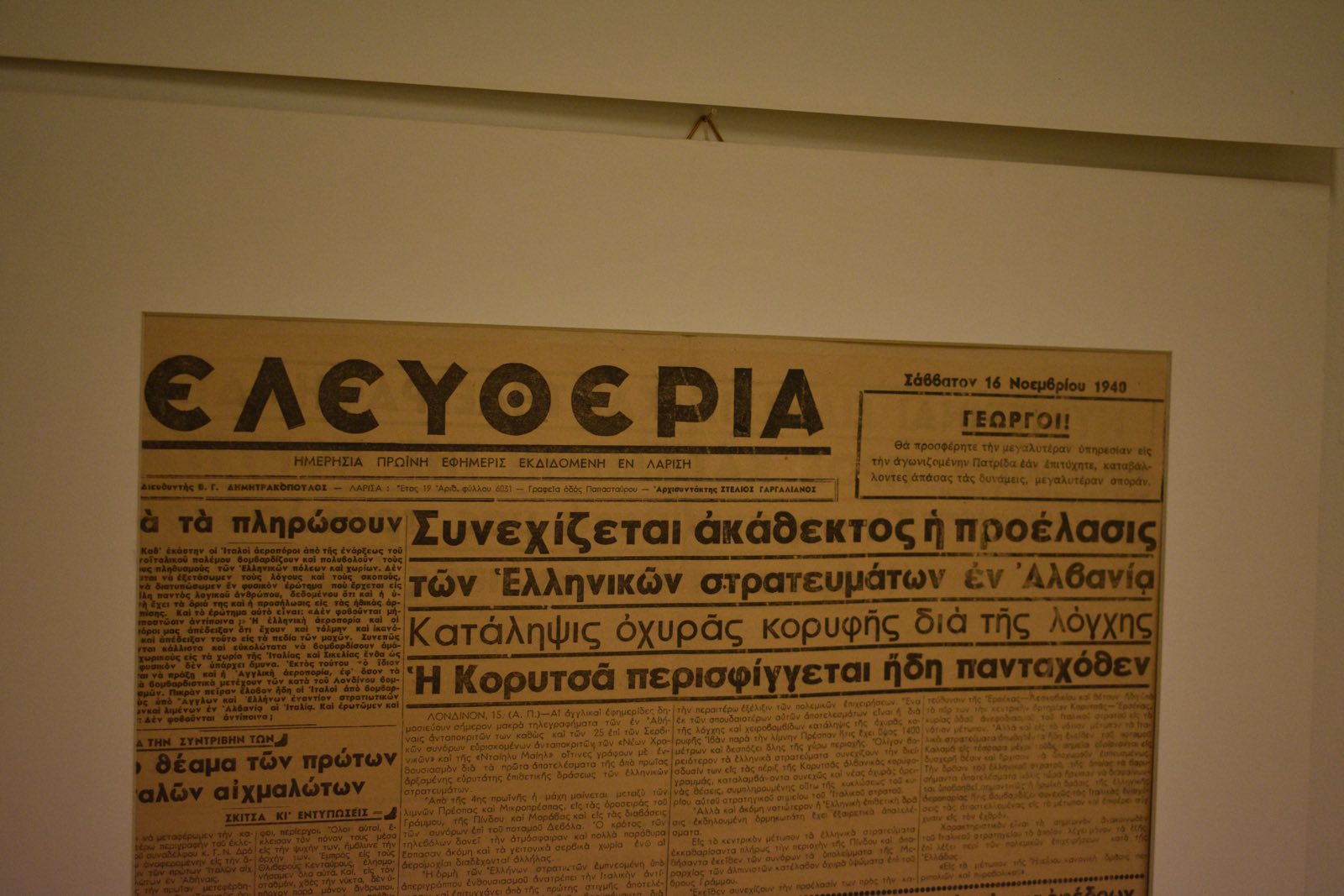 Με συγκίνηση και ιστορικό ενδιαφέρον πραγματοποιήθηκαν το απόγευμα της Παρασκευής 24 Οκτωβρίου, τα εγκαίνια της έκθεσης «Πρωτοσέλιδα Πολέμου: Ο Τύπος μπροστά στο Έπος του ’40», στο Λαογραφικό Ιστορικό Μουσείο Λάρισας – «Γιώργος και Λένα Γουργιώτη». Η εκδήλωση εντάσσεται στις εκδηλώσεις της Περιφέρειας Θεσσαλίας για τον εορτασμό της εθνικής επετείου της 28ης Οκτωβρίου, και πραγματοποιήθηκε σε συνεργασία με το Μουσείο, υπό την επιμέλεια της Φανής Καλοκαιρινού και του Βασίλη Νικόλτσιου.