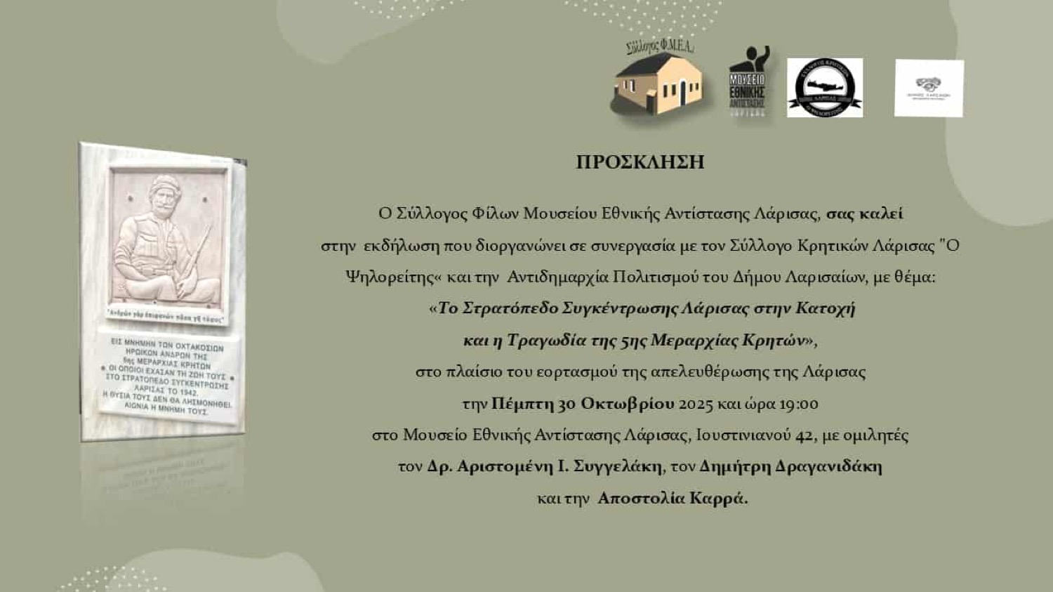 Εκδήλωση με θέμα: «Το Στρατόπεδο Συγκέντρωσης Λάρισας στην Κατοχή και η Τραγωδία της 5ης Μεραρχίας Κρητών», διοργανώνει ο Σύλλογος Φίλων του Μουσείου Εθνικής Αντίστασης Λάρισας, σε συνεργασία με τον Σύλλογο Κρητικών Λάρισας “Ο Ψηλορείτης” και την Αντιδημαρχία Πολιτισμού του Δήμου Λάρισας, τιμώντας την 81η επέτειο της απελευθέρωσης της πόλης από τη Γερμανική Κατοχή. Η εκδήλωση θα πραγματοποιηθεί στο Μουσείο Εθνικής Αντίστασης Λάρισας, Ιουστινιανού 42, την Πέμπτη 30 Οκτωβρίου 2025 και ώρα 19:00.
