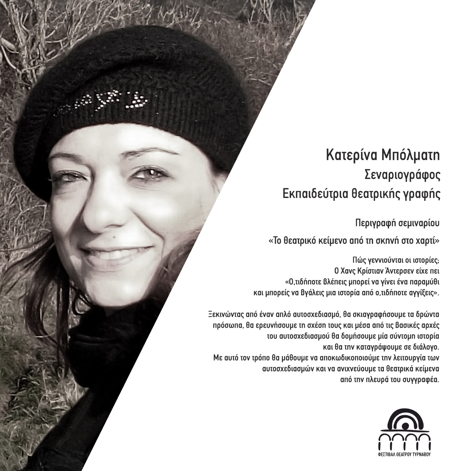 Μέσω ανακοίνωσης του, ο Δήμος Τυρνάβου ενημερώνει για την παρουσία της σεναριογράφου και εκπαιδεύτριας θετρικής γραφής, Κατερίνα Μπολμάτη στο 1ο Φεστιβάλ Θεάτρου Τυρνάβου.