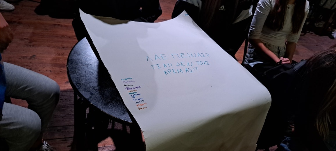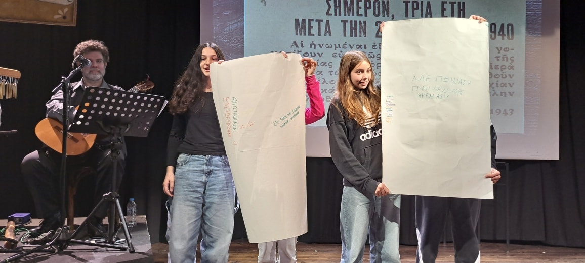 Με αφετηρία το ιστορικό πλαίσιο της περιόδου 1940–1945, οι δημιουργοί της παράστασης προσκάλεσαν τους μαθητές και τις μαθήτριες σε ένα διαδραστικό ταξίδι μνήμης, με ζωντανή μουσική, ερωτήσεις, παιχνίδι και βιωματικές δραστηριότητες. Η Ιστορία «πήρε ζωή» και μετατράπηκε σε εμπειρία, κάνοντας τα παιδιά να προσεγγίσουν το παρελθόν όχι ως κάτι μακρινό και στατικό, αλλά ως μια ζωντανή διαδικασία που εμπνέει και συνδέεται ουσιαστικά με το σήμερα. Η Αγλαΐα Νάκα (σχεδιασμός – εμψύχωση), ο Σπύρος Καβαλλιεράτος (κιθάρα, τραγούδι) και ο Γιώργος Κατσάρας (κρουστά) παρουσίασαν μια σύγχρονη, συμμετοχική παράσταση, όπου ο/η θεατής/τρια δεν μένει απλός παρατηρητής, αλλά γίνεται μέρος της αφήγησης, της δράσης και του ίδιου του τέλους της ιστορίας. «Τι κοινό μπορεί να έχει η Σοφία Βέμπο με τη Μαρίνα Σάττι και ο Μουσολίνι με τον Φελίνι; Ποια είναι η λέξη με την οποία ξεκίνησαν όλα; Ποιος είπε το μεγάλο “Όχι”;