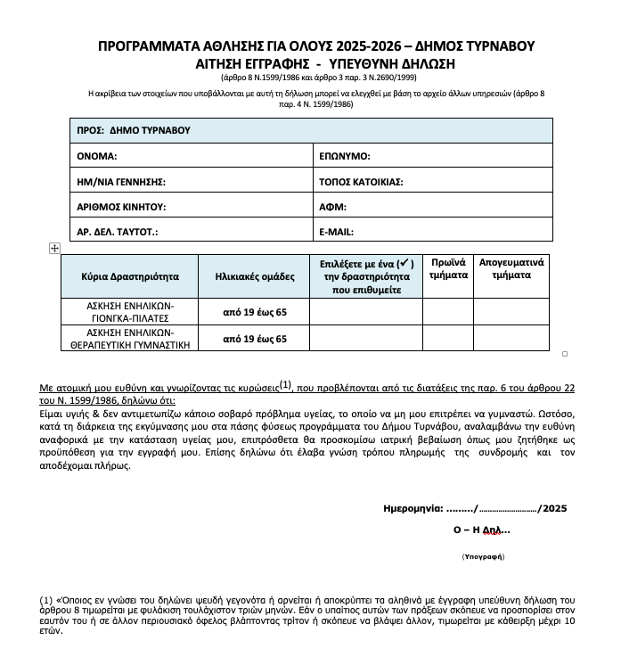 Ο Δήμος Τυρνάβου σε συνεργασία με την Γενική Γραμματεία Αθλητισμού ξεκινούν το Πρόγραμμα «Άθληση για Όλους 2025-2026»