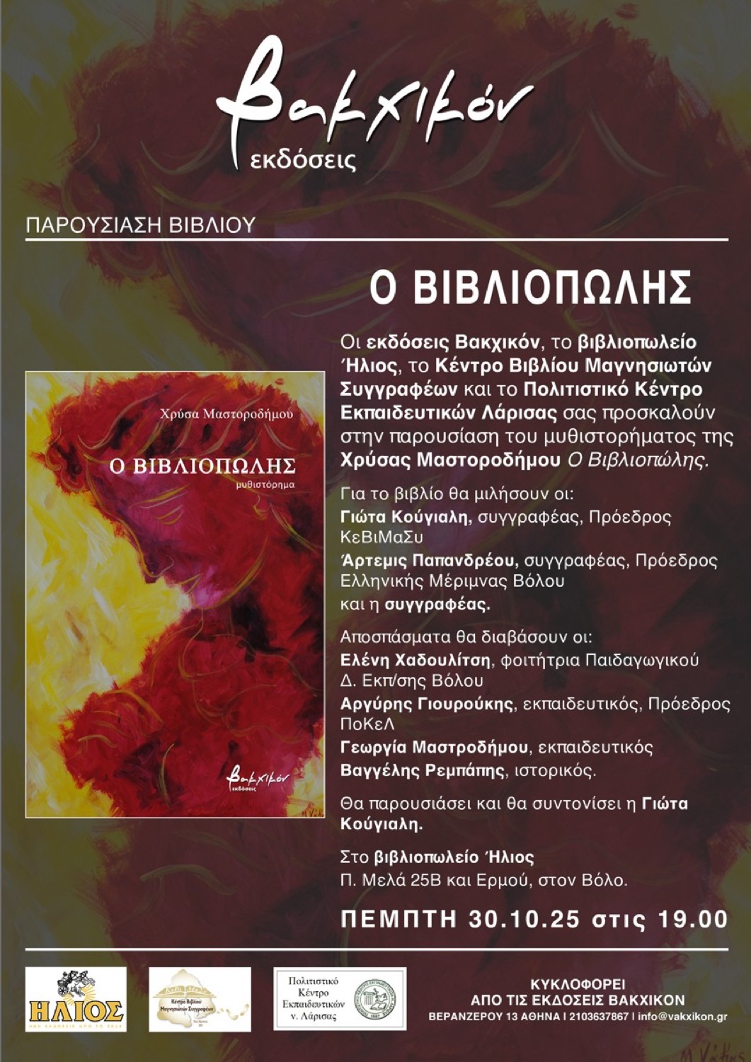 “Το ΠΟΚΕΛ, οι εκδόσεις «Βακχικόν», το βιβλιοπωλείο «Ήλιος» και το ΚΕΒΙΜΑΣΥ (Κέντρο Βιβλίου Μαγνησιωτών Συγγραφέων) σας προσκαλούν στην παρουσίαση του νέου μυθιστορήματος της εκπαιδευτικού Χρύσας Μαστοροδήμου «Ο βιβλιοπώλης», την Πέμπτη, 30 Οκτωβρίου 2025 και ώρα 7:00 μ.μ. στο βιβλιοπωλείο Ήλιος, στον Βόλο (Π. Μελά 25β και Ερμού, Βόλος, τηλέφ. 2421076424) με ελεύθερη είσοδο.