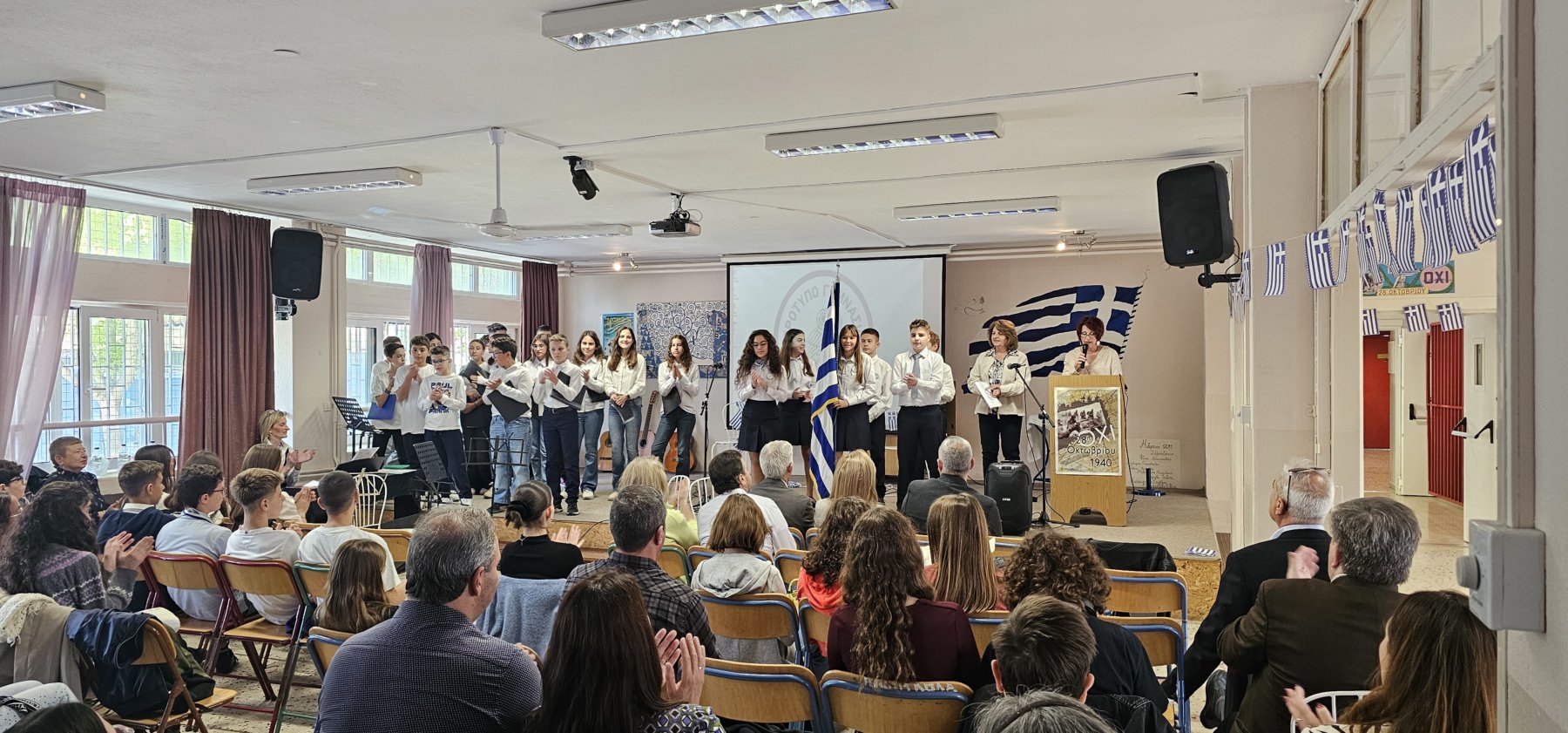 Οι μαθητές και οι μαθήτριες του σχολείου παρουσίασαν ένα εξαιρετικό μουσικό και καλλιτεχνικό πρόγραμμα, το οποίο περιλάμβανε πατριωτικά τραγούδια, απαγγελίες ποιημάτων, θεατρικά δρώμενα και αφηγήσεις Η εκδήλωση αποτέλεσε μια ουσιαστική υπενθύμιση των διαχρονικών αξιών της ελευθερίας, της ειρήνης και της δημοκρατίας.
