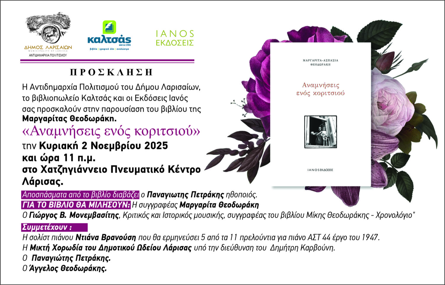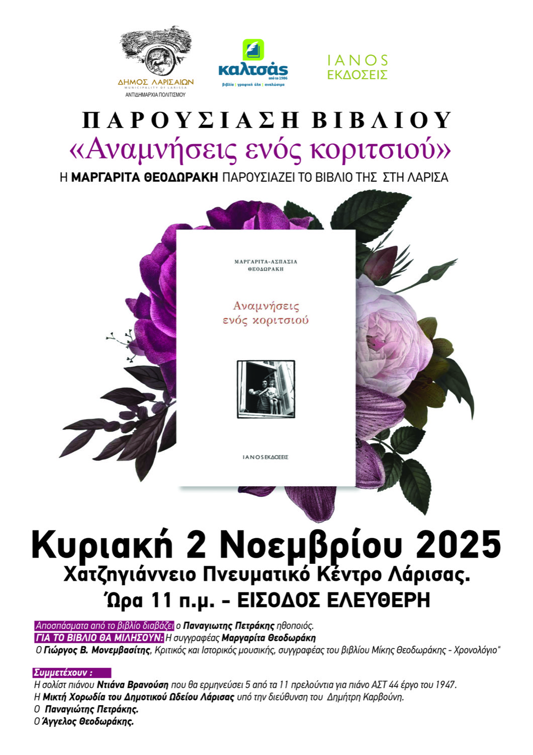 Η Αντιδημαρχία Πολιτισμού του Δήμου Λαρισαίων, το βιβλιοπωλείο Καλτσάς και οι Εκδόσεις Ιανός σας προσκαλούν στην παρουσίαση του βιβλίου της Μαργαρίτας Θεοδωράκη «Αναμνήσεις ενός κοριτσιού» την Κυριακή 2 Νοεμβρίου 2025 και ώρα 11 π.μ. στο Χατζηγιάννειο Πνευματικό Κέντρο Λάρισας.