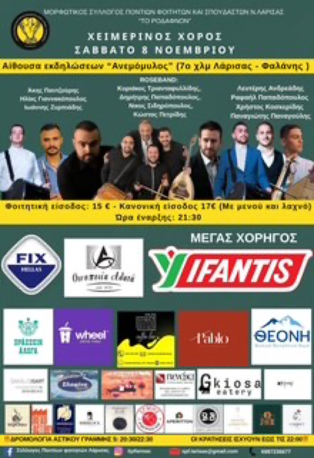 Ο Μορφωτικός Σύλλογος Ποντίων Φοιτητών και Σπουδαστών Νομού Λάρισας “ΤΟ ΡΟΔΑΦΝΟΝ” βρίσκεται στην ευχάριστη θέση να σας ανακοινώνει την διοργάνωση του ετήσιου χειμερινού χορού, το Σάββατο 8 Νοεμβρίου 2025 και ώρα 21:30.