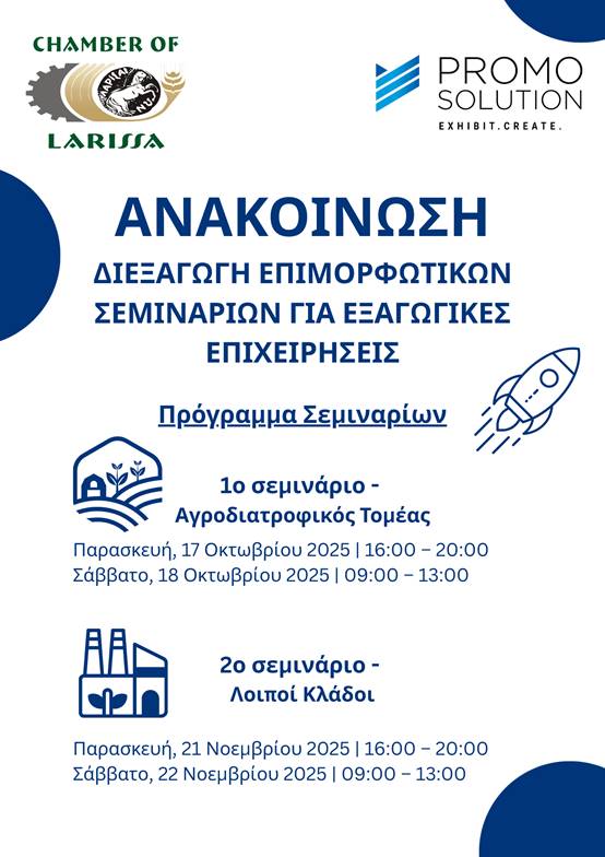 Το Επιμελητήριο Λάρισας, σε συνεργασία με την εταιρεία Promo Solution, διοργανώνει σεμινάρια επιμόρφωσης, με στόχο την ενίσχυση της εξαγωγικής δραστηριότητας και της ανταγωνιστικότητας των επιχειρήσεων της περιοχής.