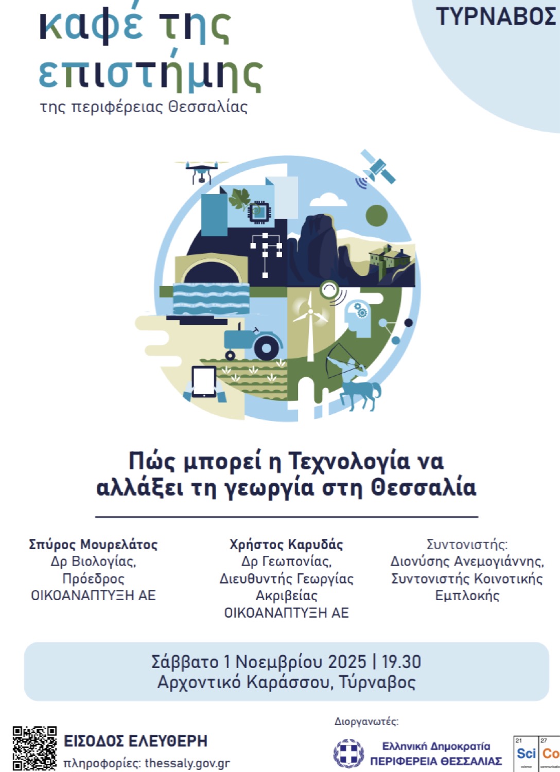 Η Περιφέρεια Θεσσαλίας, σε συνεργασία με τον μη κερδοσκοπικό οργανισμό «SciCo – Επιστήμη Επικοινωνία», συνεχίζει τη σειρά ανοιχτών εκδηλώσεων «Καφέ της Επιστήμης της Περιφέρειας Θεσσαλίας», που φέρνουν την επιστήμη πιο κοντά στους πολίτες. Το δεύτερο ραντεβού θα πραγματοποιηθεί το Σάββατο 1 Νοεμβρίου, στον Τύρναβο, με θέμα: «Πώς μπορεί η τεχνολογία να αλλάξει τη γεωργία στη Θεσσαλία;»