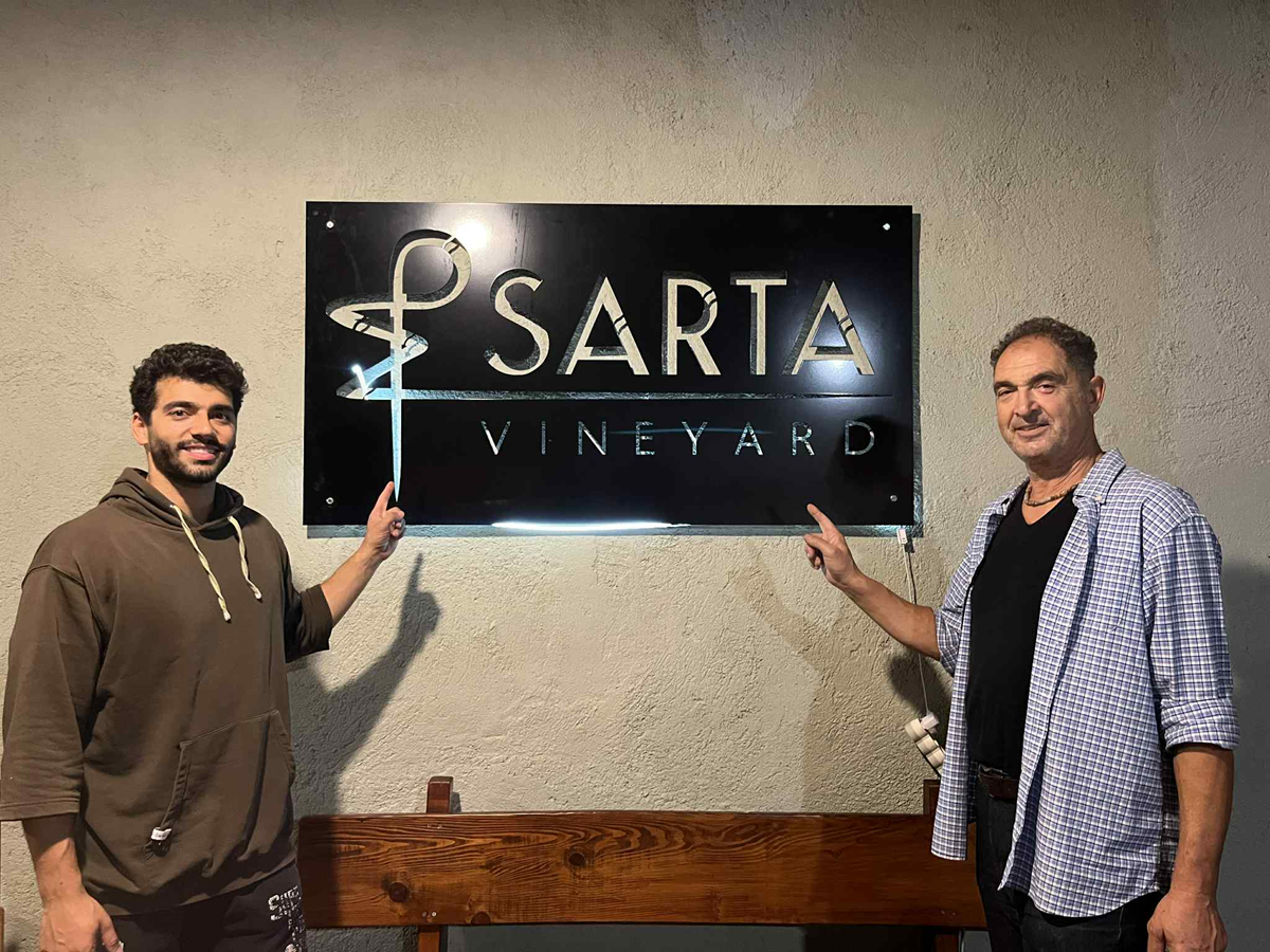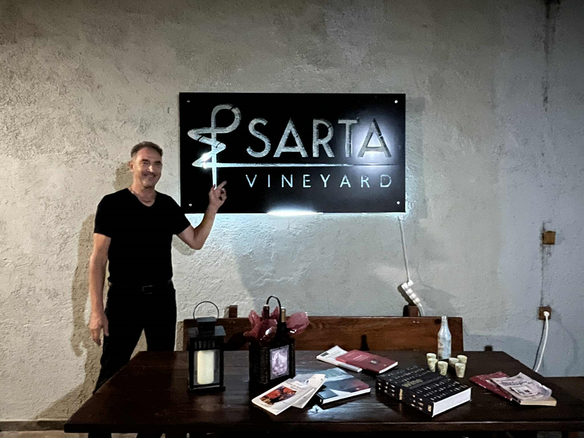 Το 2006, έβαλε τα πρώτα στρέμματα αμπέλι. Με 5 ξεκίνησε. Συμβουλεύτηκε την Αμπελοοινική και τον Λαρισαίο Βασίλη Μαρίνο που έχει πλέον τη διεύθυνσή της για να διάλεξε τις ποικιλίες, παρόλο που το αμπέλι του ήταν μόλις 5 στρέμματα. Έκανε και εδαφολογική ανάλυση, έλεγξε και τις επιτρεπόμενες και προτεινόμενες ποικιλίες της κάθε περιοχής με βάση τη ΔΑΟΚ και διάλεξε. Ασύρτικο και μαλαγουζιά για λευκές και syrah και ξινόμαυρο για κόκκινο. Σήμερα τα στρέμματα είναι 35. Βγάζουν το δικό τους κρασί. Με την ετικέτα «Σάρτα». «Μην ξεχάσω να σου πω τι σημαίνει Σάρτα»… από το Σάββατο είχαμε αφήσει αυτή την εκκρεμότητα. Το όνομα που διάλεξε για την ετικέτα των κρασιών που παράγει. Τελικά, μου το είπε την Κυριακή το βράδυ, στην εξώπορτα όταν μας ξεπροβόδιζε. Είχαν φορτωθεί τα βαρέλια με το τσίπουρο και είμασταν έτοιμοι να φύγουμε. «Είναι η παρέα που τραγουδά τα παραδοσιακά Χριστουγεννιάτικα και Πρωτοχρονιάτικα κάλαντα στο Μεγάλο Μοναστήρι. Αυτά της Ανατολικής Ρωμυλίας».