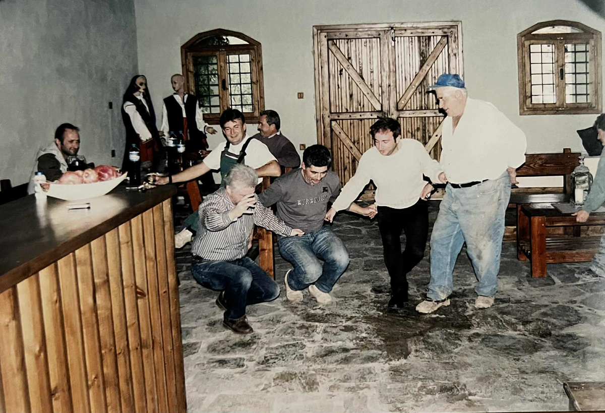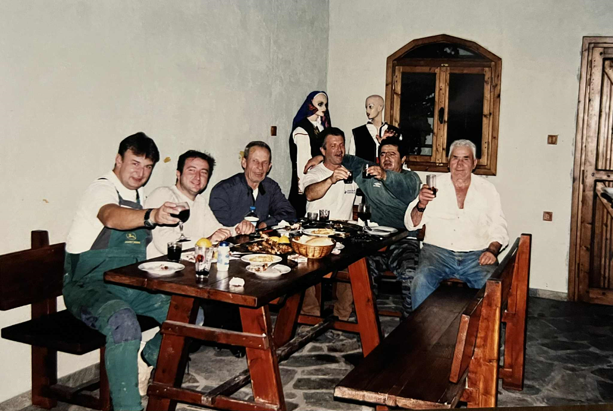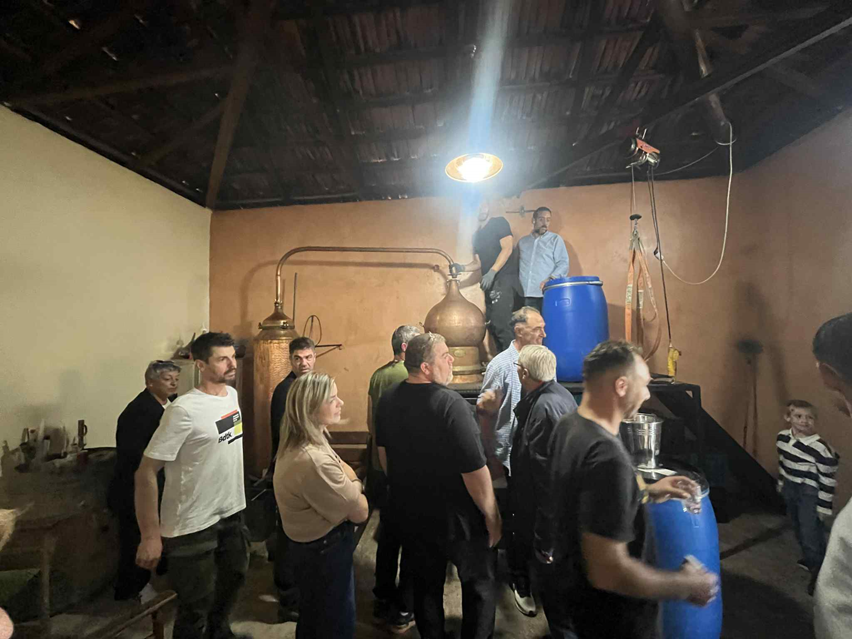 «Ξεκινήσαμε με έναν γαμπρό πρώτης μου ξαδέρφης. Ήταν το 1997 ή το 1998, θα σε γελάσω. Ο θείος μου και πεθερός του είχε ένα παλιάμπελο. Ήταν από αυτούς που είχε καζάνι και τη σχετική άδεια. Από αυτά που μοιράστηκαν το 1932… Αποφάσισαν να αναβιώσουν το έθιμο. Της παρέας. Το ανοιχτό. Όπως τότε που βράζανε στη μπάρα… Να τρυγήσουν τα σταφύλια, τα κάνουν στέμφυλα και να τα βράσουν όλο το χωριό μαζί ένα Σάββατο. Και το κάνανε. Βάλανε και ένα αρνί στη σούβλα και βράσανε οι ίδιοι μετά από χρόνια και πάλι τσίπουρο. Το κάνανε σαν γιορτή. Μέχρι τότε όσοι έβραζαν ακόμη, έβραζαν μόνοι τους στα σπίτια τους.