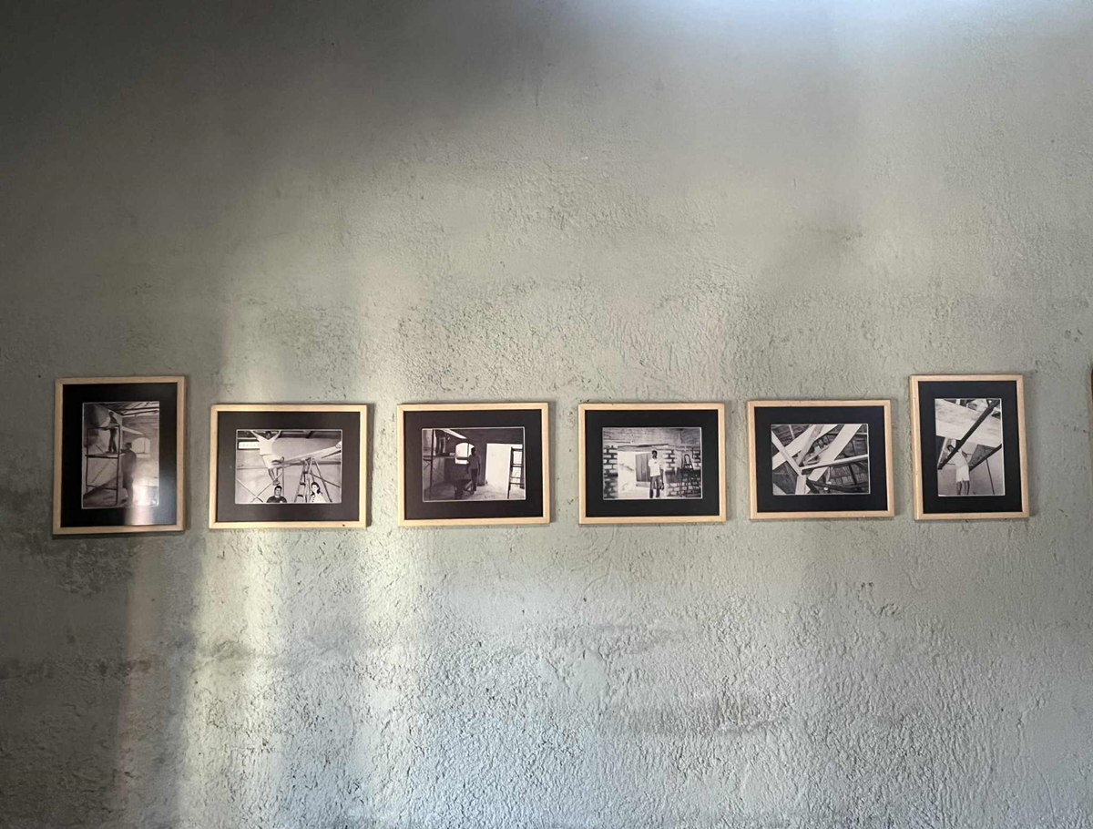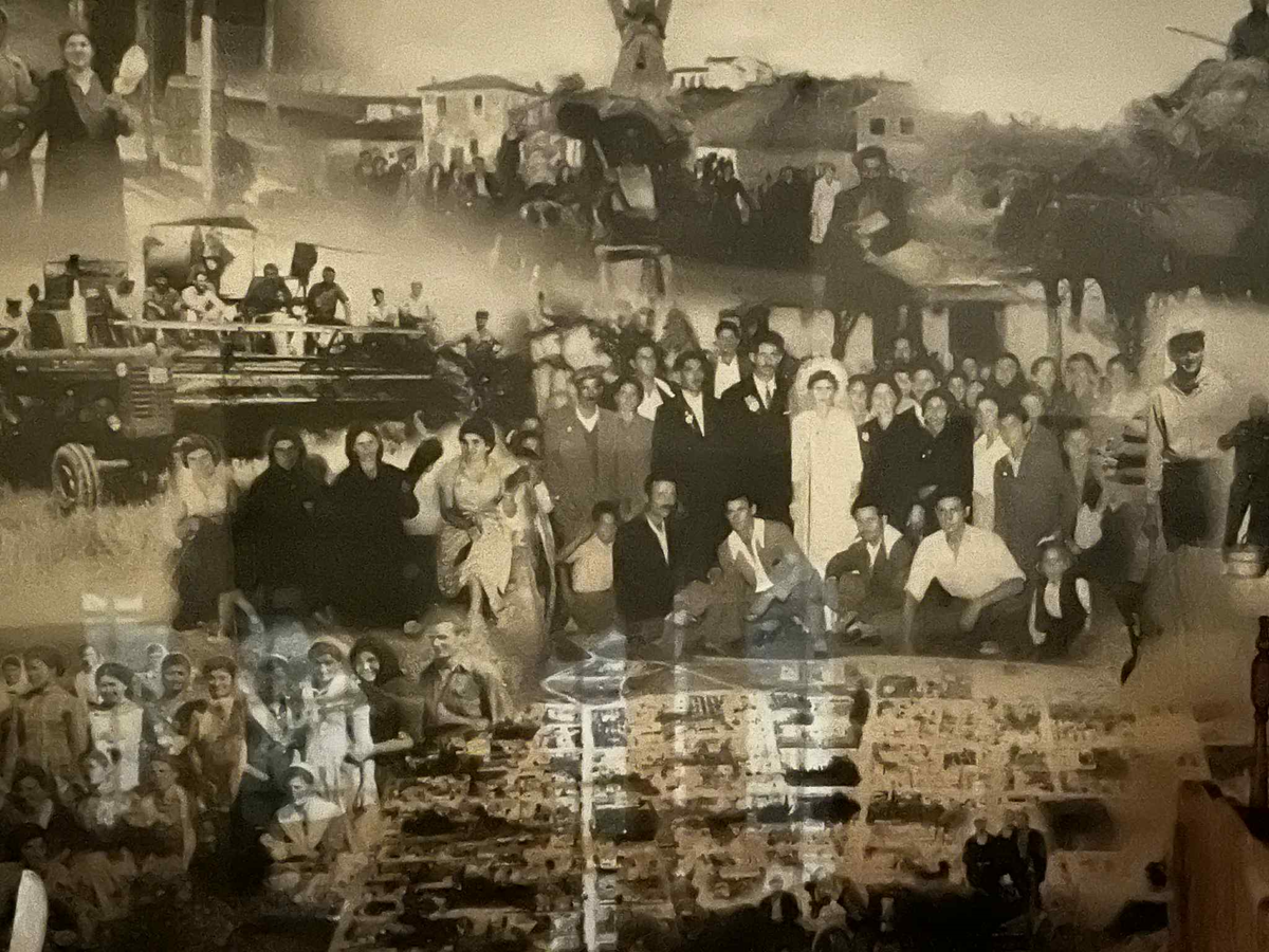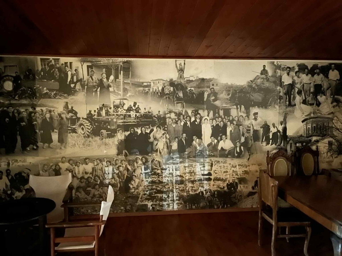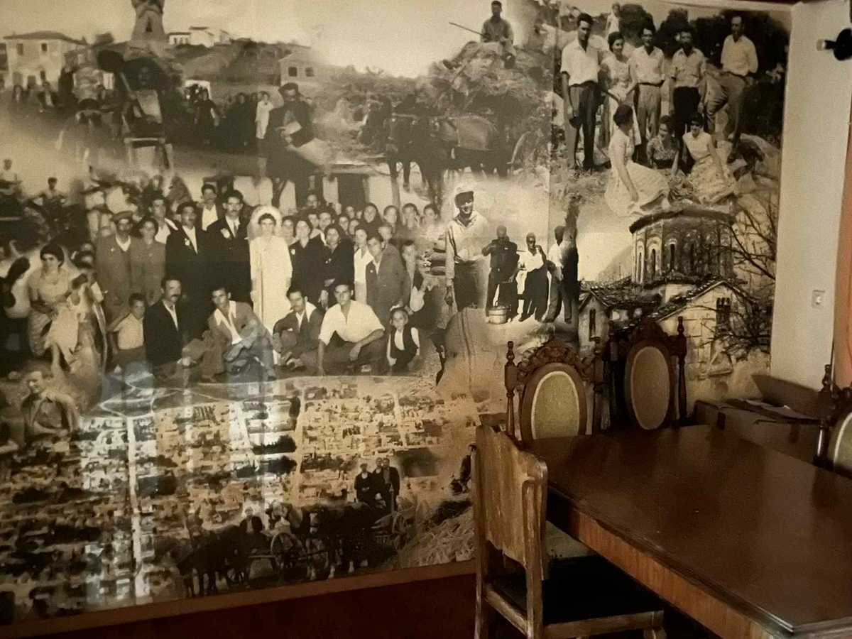 Η τοιχογραφία κλέβει την παράσταση. Είναι εντυπωσιακή. Σε καθηλώνει. Ο ένας τοίχος είναι καλυμμένος ολόκληρος με μια ταπετσαρία-κολάζ με φωτογραφίες από το χωρίο από τη δεκαετία του 1950 και μετά. Αλώνια και κάρα και αλωνιστικές μηχανές αργότερα, γυναίκες να μαζεύουν βαμβάκι, φωτογραφίες από γάμους, το σχολείο, την εκκλησία, μια πανοραμική του χωριού, ένα πλάνο από το έθιμο «Καμήλες και Ντιβιτζήδες, από μια Πρωτομαγιά. Στο κέντρο είναι η νυφιάτικη φωτογραφία των γονιών του. Τα όρια από όλα αυτά χάνονται και είναι σαν να βλέπεις την ιστορία του χωριού, των προσφύγων από το Μεγάλο Μοναστήρι της Ανατολικής Ρωμυλίας να ξεδιπλώνεται στο χρόνο. Σαν παλιό ασπρόμαυρο φιλμ-ντοκιμαντέρ. Ένα αφήγημα.