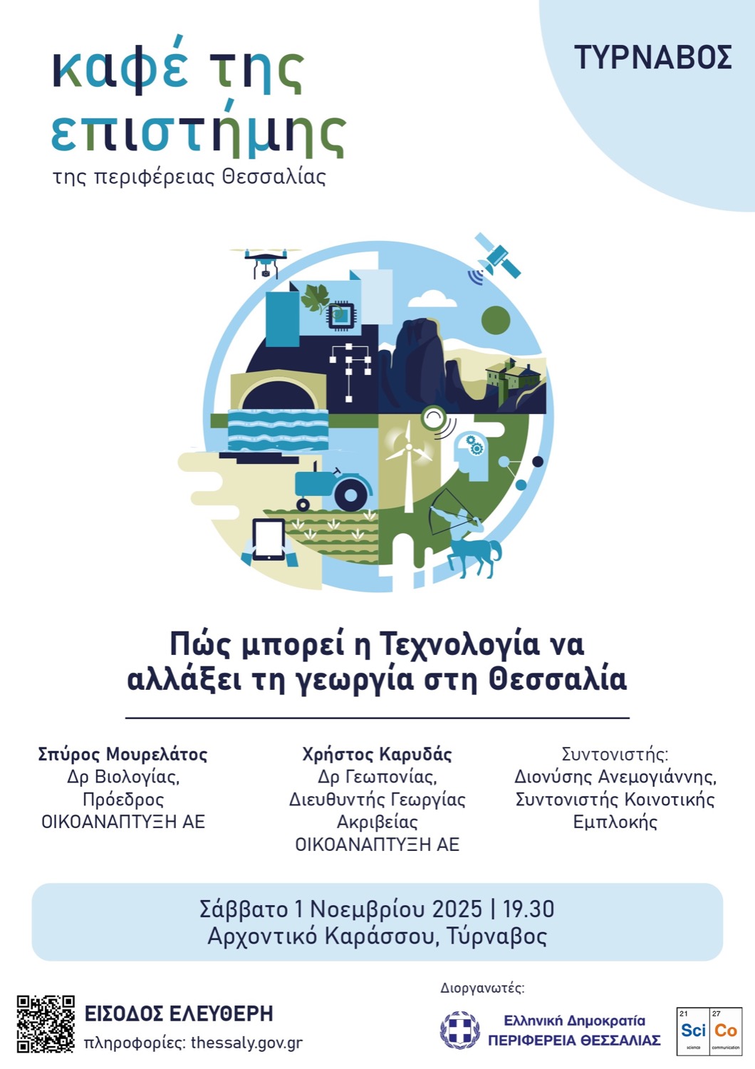 Η Περιφέρεια Θεσσαλίας, σε συνεργασία με τον μη κερδοσκοπικό οργανισμό «SciCo – Επιστήμη Επικοινωνία», συνεχίζει τη σειρά ανοιχτών εκδηλώσεων «Καφέ της Επιστήμης της Περιφέρειας Θεσσαλίας», που φέρνουν την επιστήμη πιο κοντά στους πολίτες. Το δεύτερο ραντεβού θα πραγματοποιηθεί το Σάββατο 1 Νοεμβρίου, στον Τύρναβο, με θέμα: «Πώς μπορεί η τεχνολογία να αλλάξει τη γεωργία στη Θεσσαλία;»