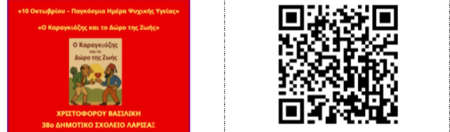 Ιδιαίτερη θέση στη δράση είχαν οι μαθητές και οι μαθήτριες της ΣΤ’ τάξης, οι οποίοι δημιούργησαν και παρουσίασαν τη θεατρική παράσταση «Ο Καραγκιόζης και το Δώρο της Ζωής». Αξιοποιώντας το παραδοσιακό θέατρο σκιών, ευαισθητοποίησαν όλο το σχολείο σχετικά με την αξία της προσφοράς και της αλληλεγγύης. Αποσπάσματα από την παράσταση μπορείτε να δείτε, εάν σκανάρετε τον παρακάτω QR-code.