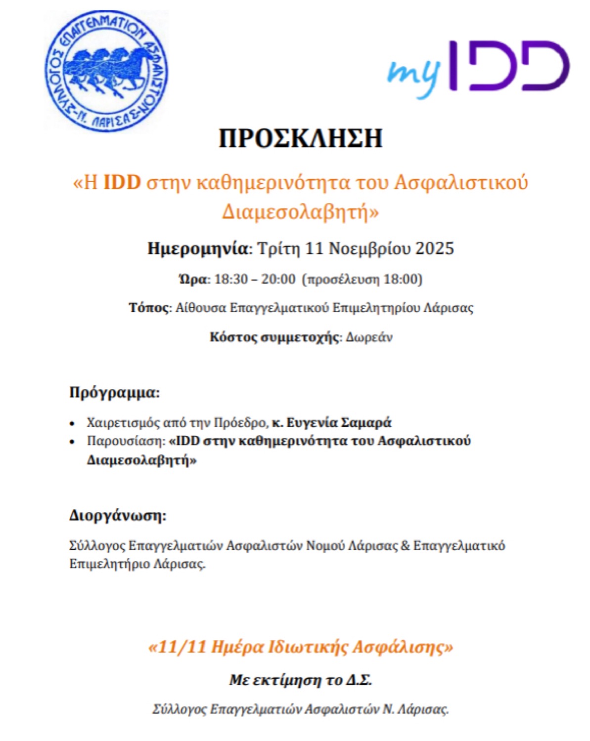 - Παρουσίαση: «IDD στην καθημερινότητα του Ασφαλιστικού Διαμεσολαβητή» από τον Αλέξανδρο Πατσό, ιδρυτή της myIDD.