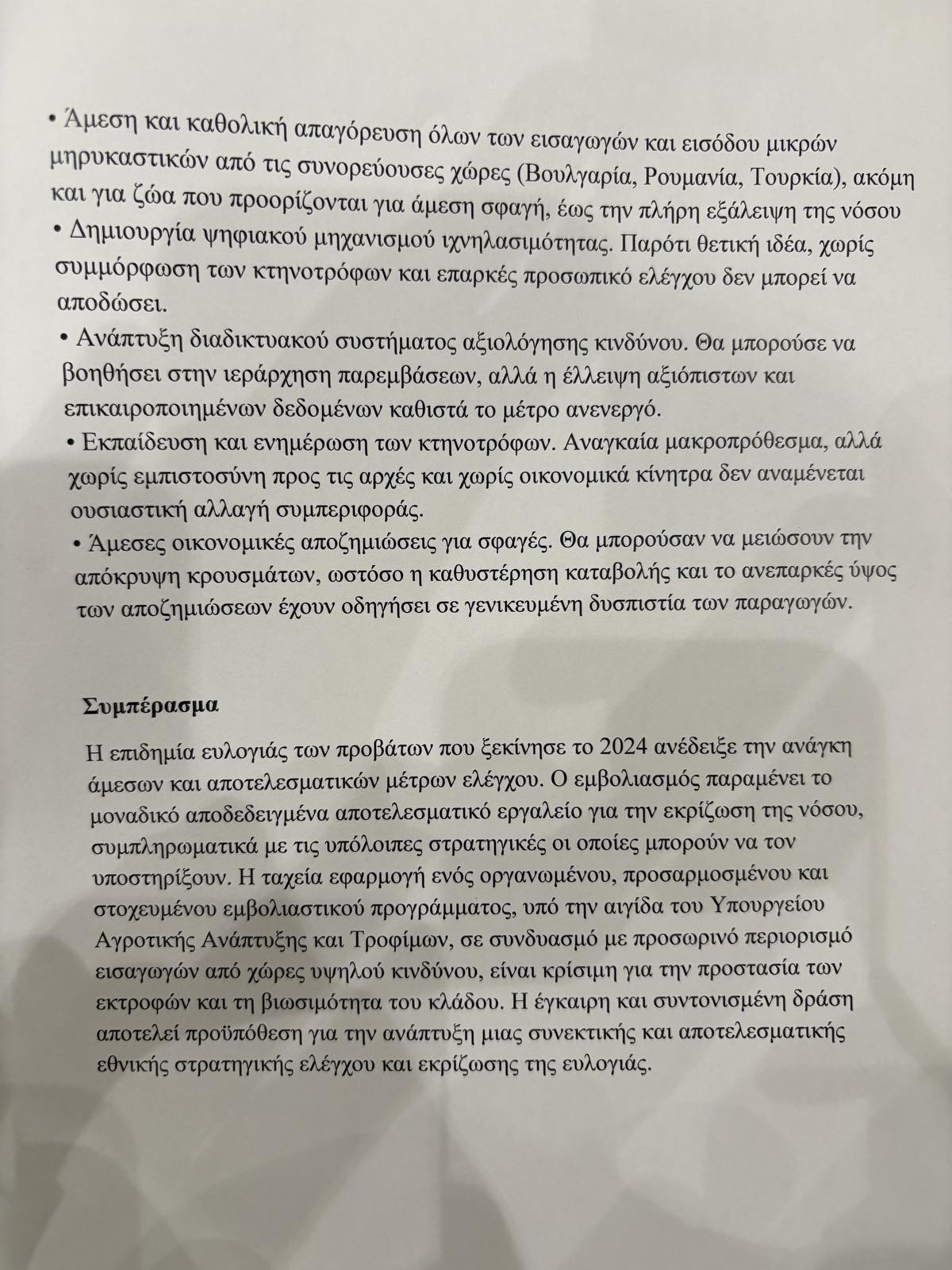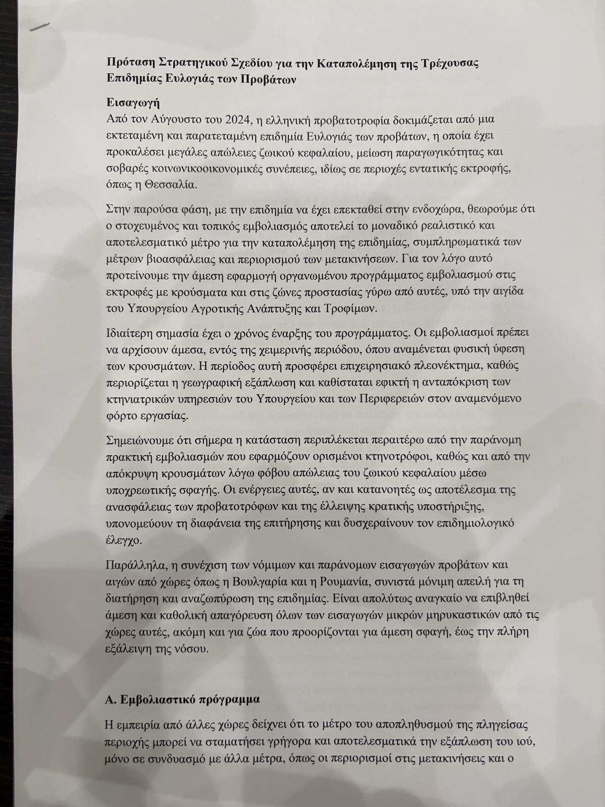 Μάλιστα αποστέλλουν στο υπουργείο την Πρόταση Στρατηγικού Σχεδίου για την Καταπολέμηση της Τρέχουσας Επιδημίας Ευλογίας των Προβατών στην οποία αποσπασματικά αναφέρονται τα εξής: