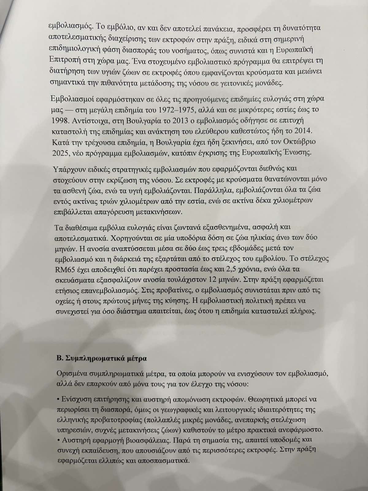 «Από τον Αύγουστο του 2024, η ελληνική δοκιμασία προβατοτροφία δοκιμάζεται από μια εκτεταμένη και παρατεταμένη επιδημία ευλογιάς των προβάτων, η οποία έχει προκαλέσει μεγάλες απώλειες ζωικού κεφαλαίου, μείωση της παραγωγικότητας και σοβαρές κοινωνικοοικονομικές συνέπειες, ιδίως σε περιοχές εντατικής εκτροφής, όπως η Θεσσαλία. Στην παρούσα φάση, με την επιδημία να έχει επεκταθεί στην ενδοχώρα, θεωρούμε ότι ο στοχευμένος και τοπικός εμβολισμός αποτελεί το μοναδικό ρεαλιστικό και αποτελεσματικό μέτρο για την καταπολέμησή της επιδημίας, συμπληρωματικά των μέτρων βιοασφάλειας και περιορισμού των μετακινήσεων.