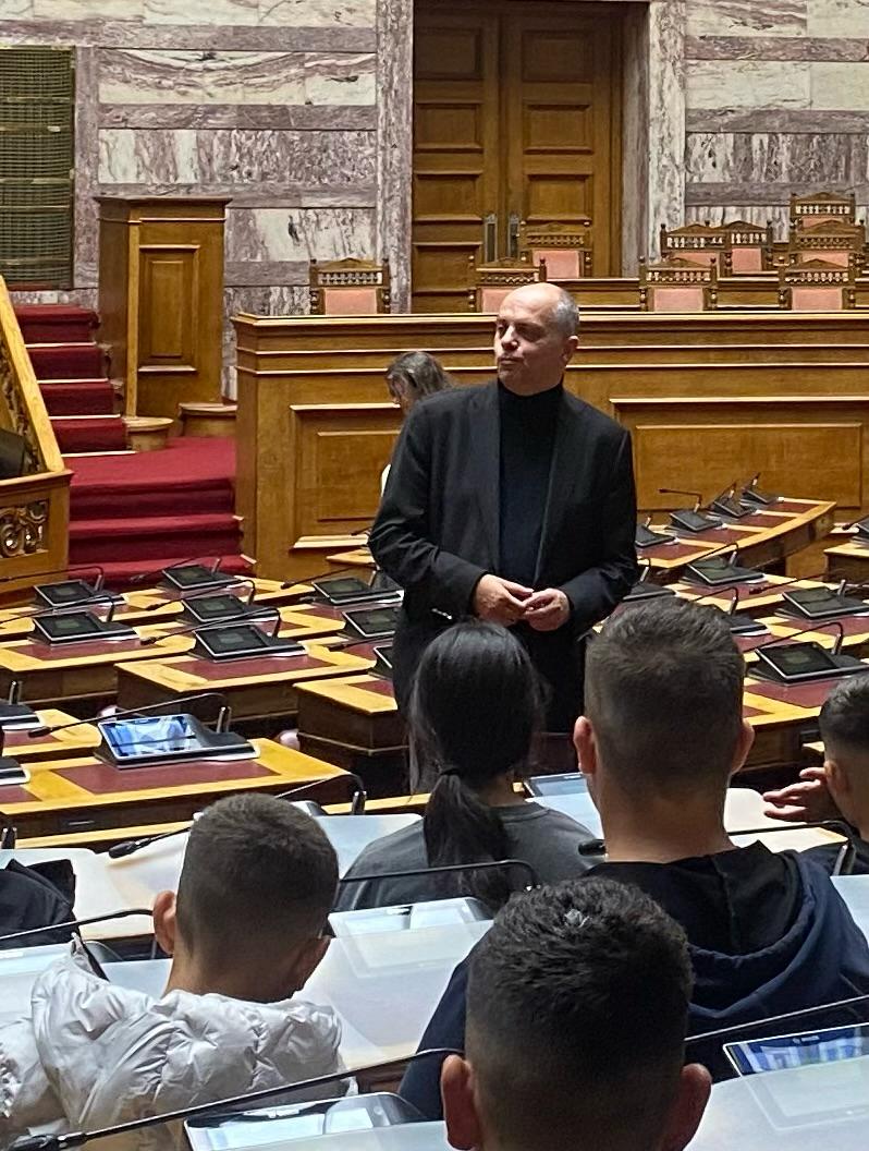 Οι μικροί μαθητές περιηγήθηκαν στους χώρους του Ελληνικού Κοινοβουλίου και είχαν την ευκαιρία να γνωρίσουν από κοντά πώς λειτουργεί το πολίτευμά μας. Ο κ. Καπετάνος τους ξενάγησε στην Αίθουσα της Ολομέλειας, εξηγώντας με απλά λόγια τη διαδικασία λήψης αποφάσεων και τον ρόλο του Βουλευτή στη Δημοκρατία.