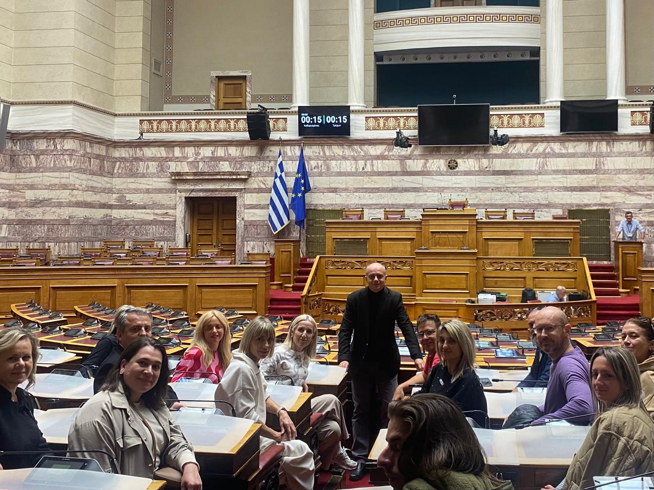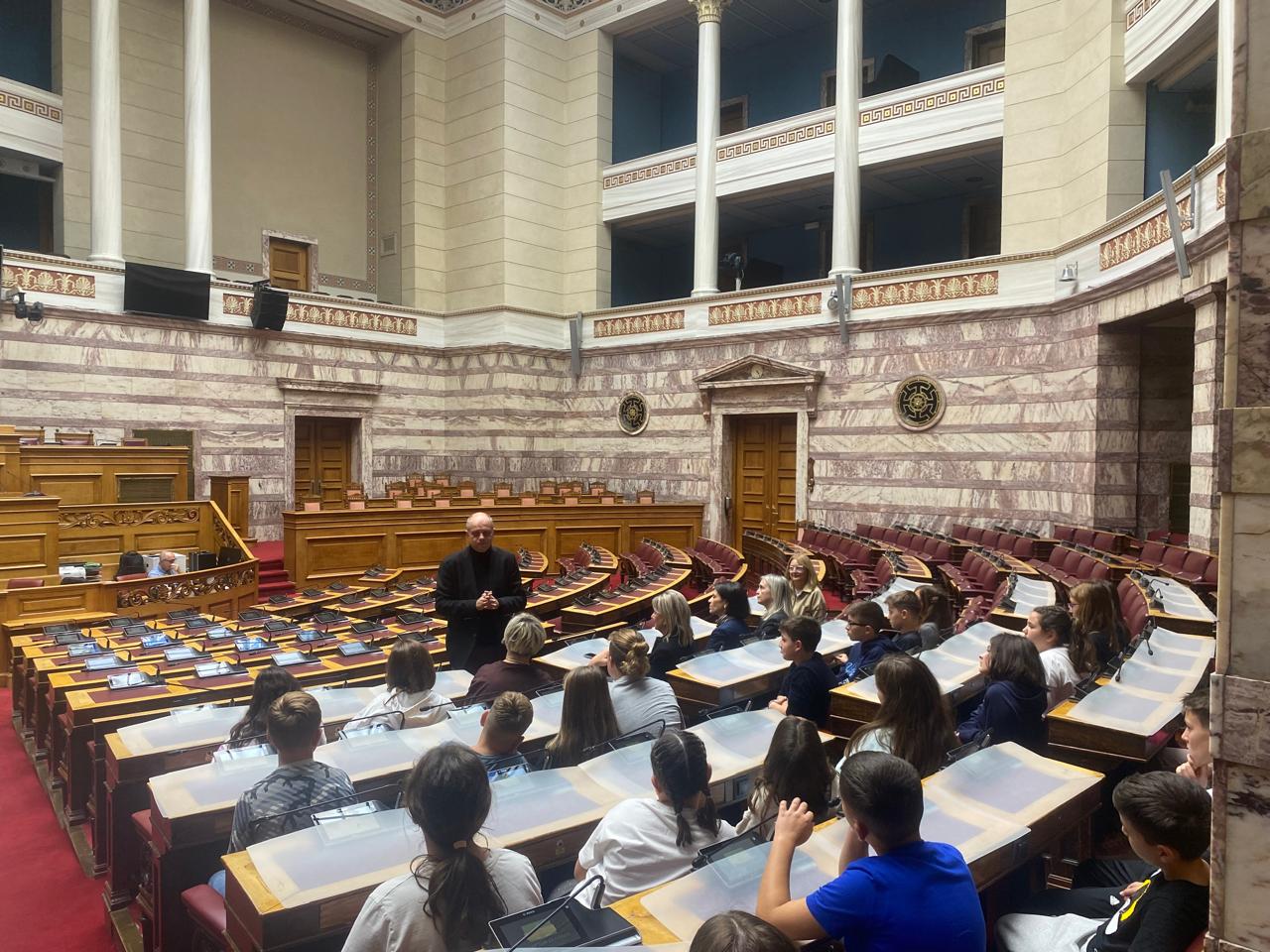Οι μικροί μαθητές περιηγήθηκαν στους χώρους του Ελληνικού Κοινοβουλίου και είχαν την ευκαιρία να γνωρίσουν από κοντά πώς λειτουργεί το πολίτευμά μας. Ο κ. Καπετάνος τους ξενάγησε στην Αίθουσα της Ολομέλειας, εξηγώντας με απλά λόγια τη διαδικασία λήψης αποφάσεων και τον ρόλο του Βουλευτή στη Δημοκρατία.