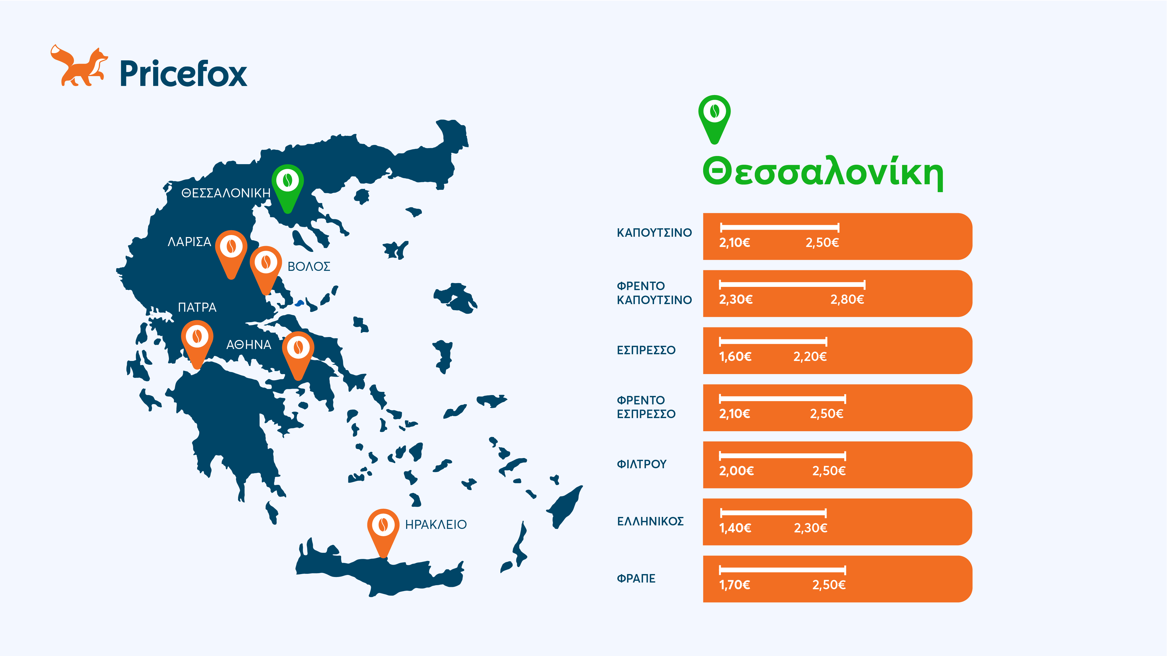 Ο φθηνότερος καφές στη συμπρωτεύουσα είναι ο ελληνικός στα €1,40, ενώ ακριβότερος ο φρέντο καπουτσίνο €2,80.