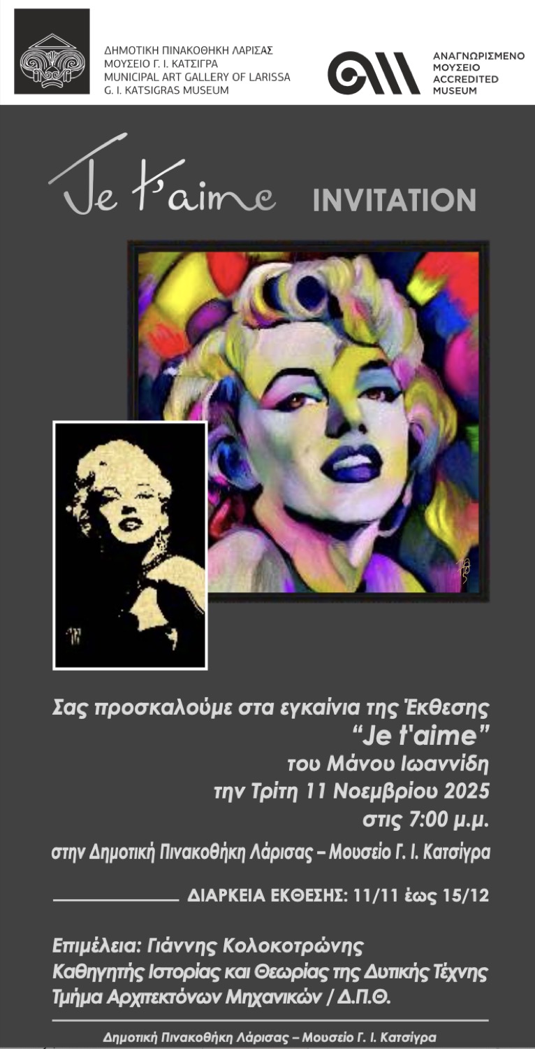 Η Δημοτική Πινακοθήκη Λάρισας – Μουσείο Γ.Ι. Κατσίγρα παρουσιάζει την έκθεση του Μάνου Ιωαννίδη (Manos) με τίτλο «Je t’aime», από τις 11 Νοεμβρίου έως και τις 15 Δεκεμβρίου 2025 σε επιμέλεια του Γιάννη Κολοκοτρώνη.