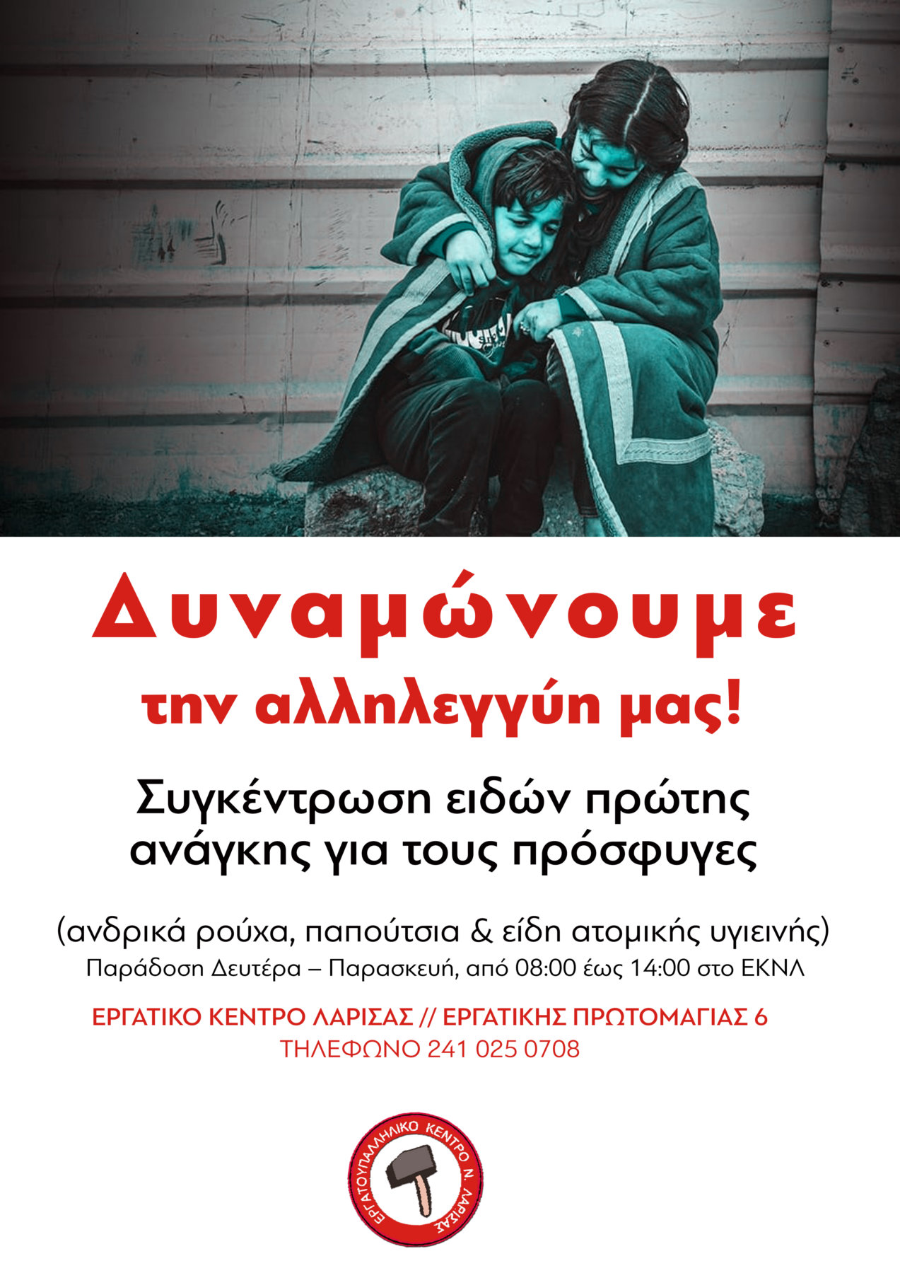 Σε σχετική ανακοίνωση αναφέρονται τα εξής: «Η Διοίκηση του Εργατικού Κέντρου Ν. Λάρισας καλεί τους εργαζόμενους και τα λαϊκά στρώματα της πόλης μας να ανταποκριθούν στο κάλεσμα του για να συγκεντρωθούν άμεσα είδη πρώτης ανάγκης για πρόσφυγες (για άντρες ρούχα, παπούτσια και άλλα είδη ατομικής υγιεινής ) στα πλαίσια της αλληλεγγύης στους πρόσφυγες που βρίσκονται στην πόλη μας, στους χώρους του ΚΥΤ στο Κουτσόχερο.