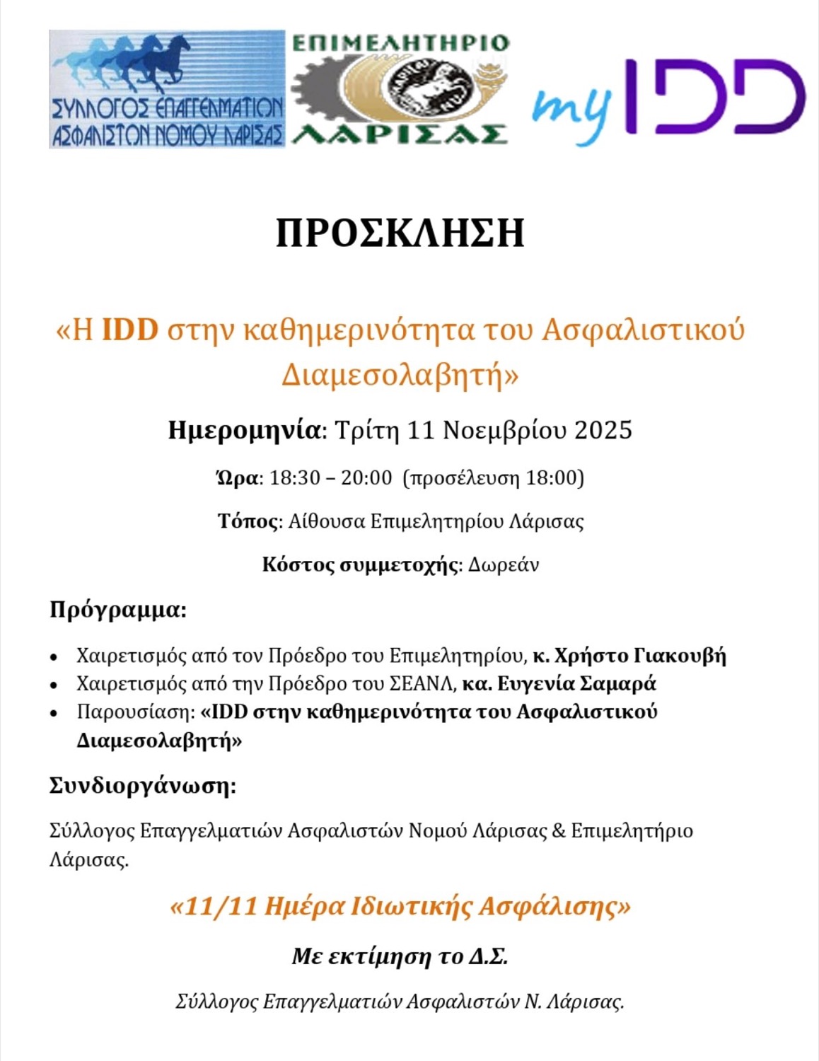 “Η IDD στην καθημερινότητα του Ασφαλιστικού Διαμεσολαβητή”: Σεμινάριο του Συλλόγου Επαγγελματιών Ασφαλιστών στο Επιμελητήριο Λάρισας