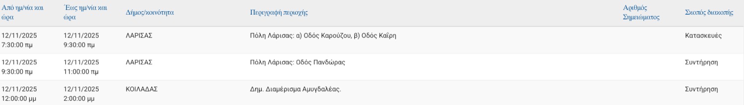 Σύμφωνα με επίσημη ενημέρωση του ΔΕΔΔΗΕ, σε τρία σημεία της Λάρισας αναμένεται να υπάρξουν διακοπές ηλεκτροδότησης.