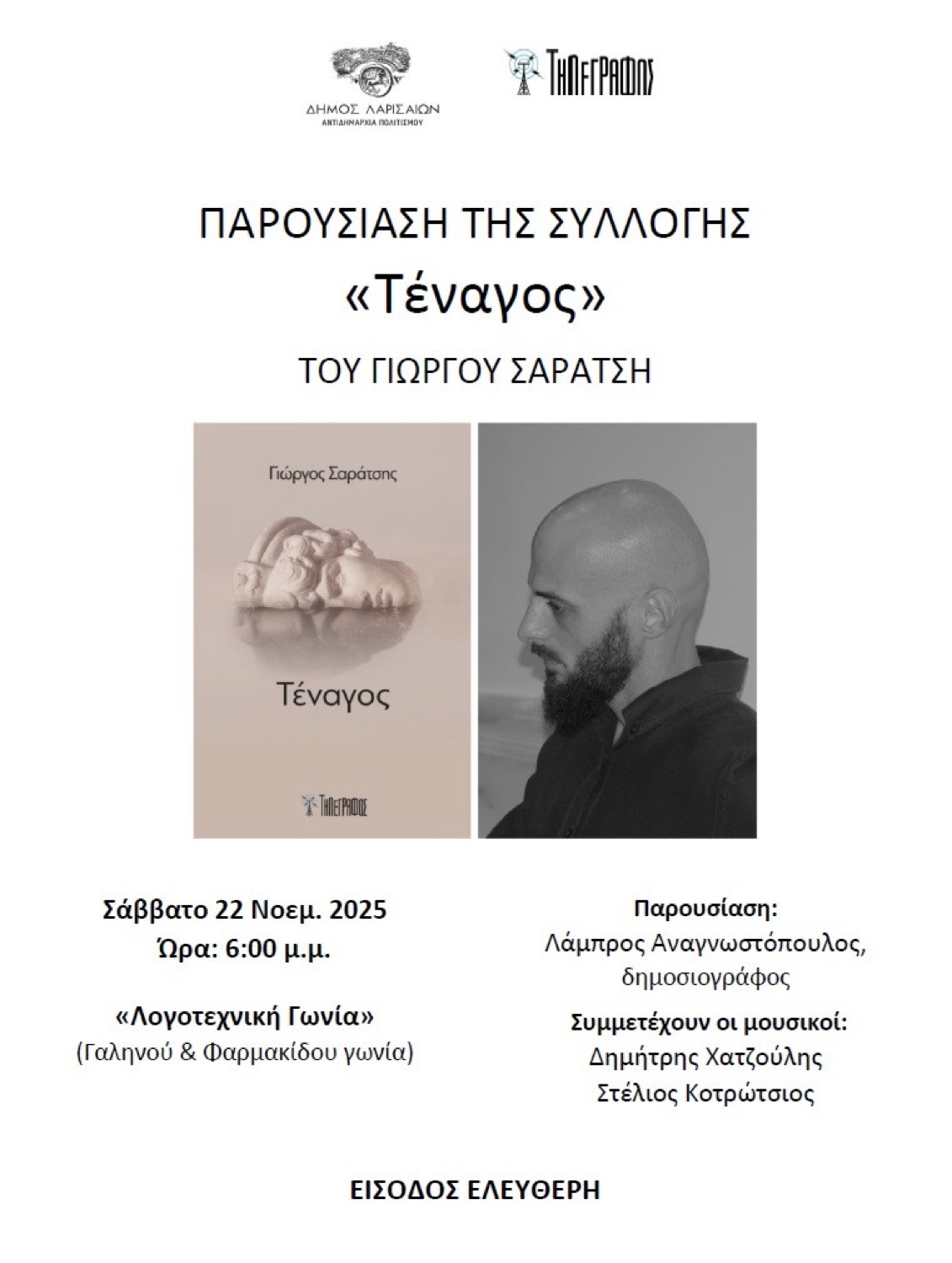 Την ποιητική συλλογή του Γιώργου Σαράτση “Τέναγος” παρουσιάζουν το Σάββατο 22 Νοεμβρίου 2025 και ώρα 18:00 στη Λογοτεχνική Γωνία (Γαληνού & Φαρμακίδου) στη Λάρισα, η Αντιδημαρχία Πολιτισμού του Δήμου Λαρισαίων και οι Εκδόσεις Τηλέγραφος.