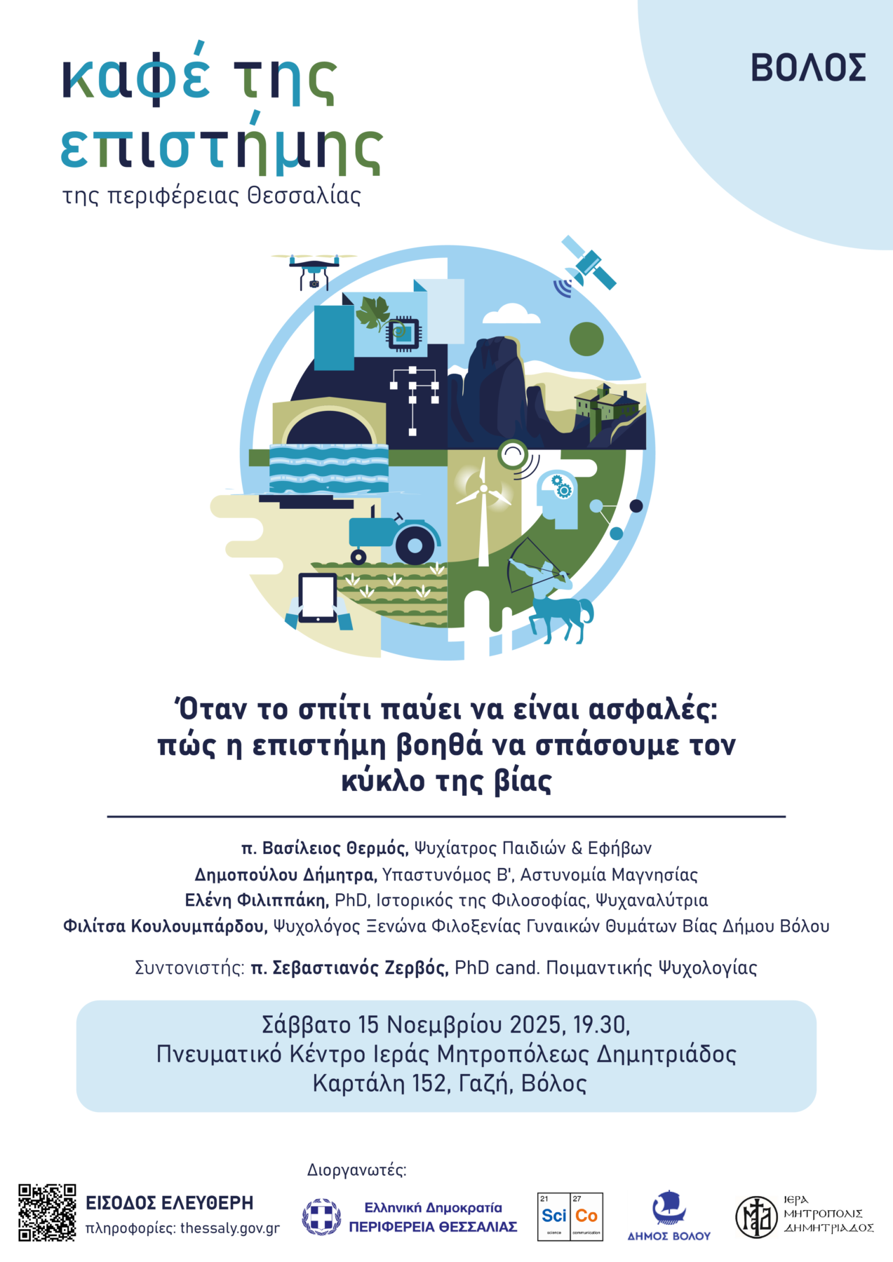 Το 4ο “Καφέ της Επιστήμης” θα πραγματοποιηθεί το Σάββατο 15 Νοεμβρίου 2025, στις 19:30, στο Πνευματικό Κέντρο Ιεράς Μητροπόλεως Δημητριάδος (Καρτάλη 152, Γαζή, Βόλος), με θέμα: «Όταν το σπίτι παύει να είναι ασφαλές: πώς η επιστήμη βοηθά να σπάσουμε τον κύκλο της βίας»
