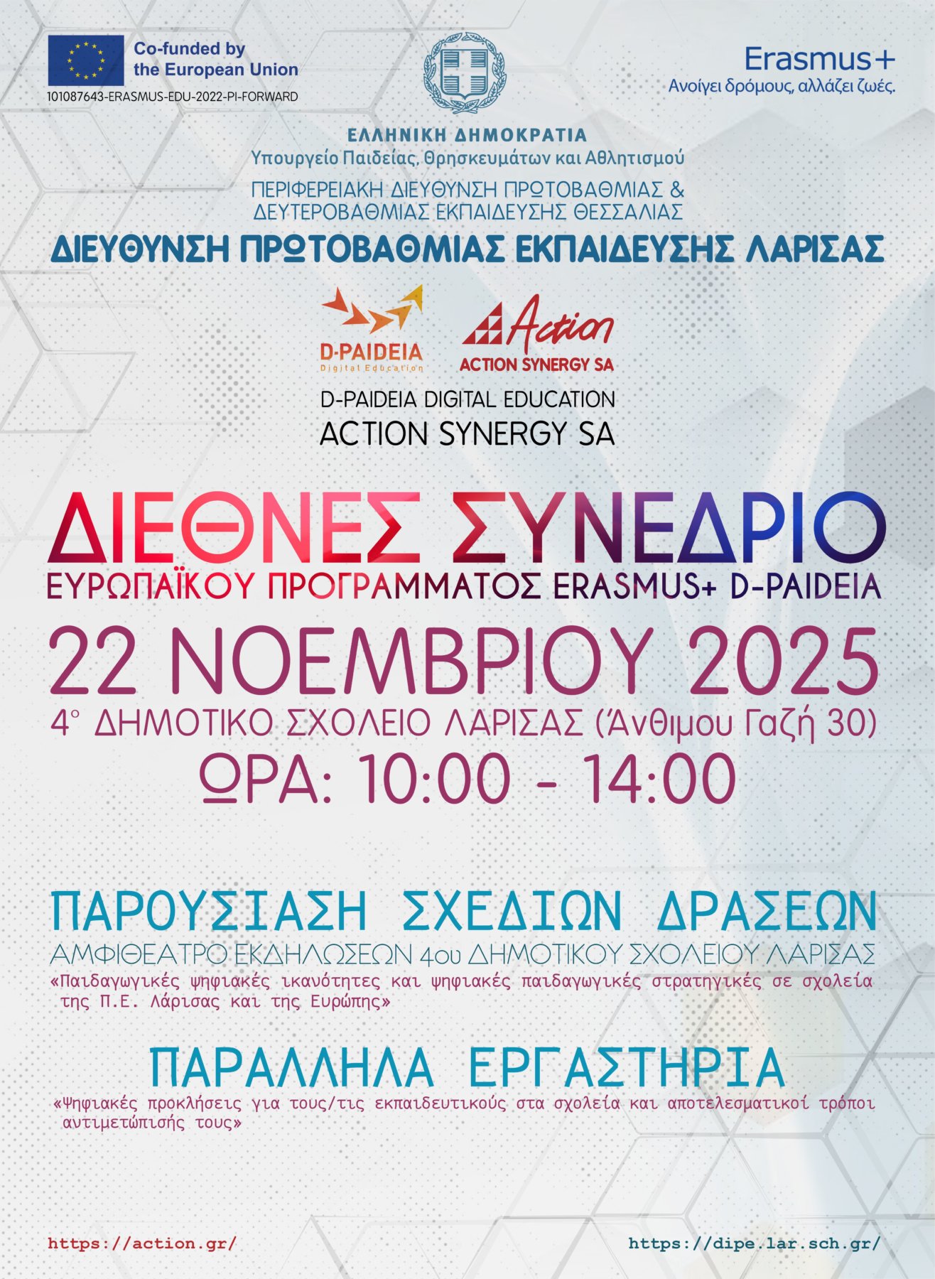 H Διεύθυνση Πρωτοβάθμιας Εκπαίδευσης Λάρισας, σε συνεργασία με τον οργανισμό Action Synergy, ο οποίος αποτελεί τον συντονιστή φορέα του Ευρωπαϊκού Προγράμματος Erasmus+ D-PAIDEIA, διοργανώνει Διεθνές Συνέδριο «D-PAIDEIA», το οποίο θα πραγματοποιηθεί στο 4ο Δημοτικό Σχολείο Λάρισας (Άνθιμου Γαζή 30), το Σάββατο 22/11/2025, και ώρα 10:00-14:00.