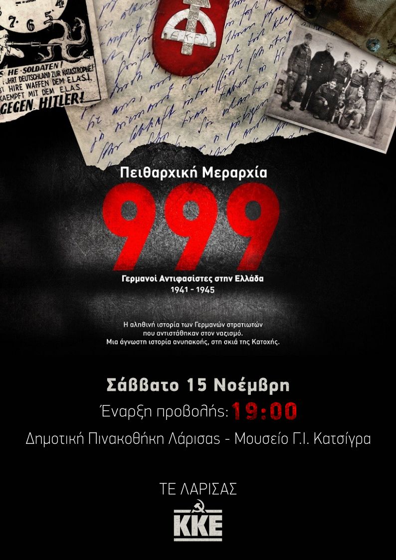 Η Τομεακή Επιτροπή Λάρισας του ΚΚΕ προβάλλει την ταινία «Η Πειθαρχική Μεραρχία “999 “», σε σκηνοθεσία Κώστα Σταματόπουλου, το Σάββατο 15 Νοεμβρίου, στις 7 μ.μ., στο αμφιθέατρο της Δημοτικής Πινακοθήκης Λάρισας.