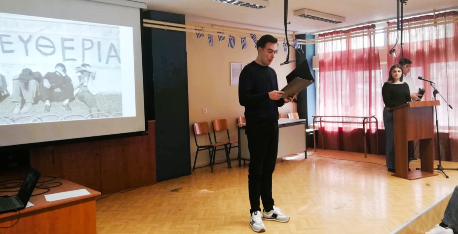Μέσα από αφηγήσεις, χρονικά, ποιητικές δημιουργίες και τραγούδια οι μαθητές/-τριες ενημερώθηκαν για τα γεγονότα της αγωνιστικής εξέγερσης των φοιτητών του Πολυτεχνείου ενάντια στη δικτατορία και εισέπραξαν πολλαπλά μηνύματα για τη δυνατότητα διαμόρφωσης ενός καλύτερου μέλλοντος με πίστη, αυτοσεβασμό, ειρηνική διεκδίκηση των δικαιωμάτων τους και προσήλωση σε υψηλά ιδανικά. Υπεύθυνος για την οργάνωση της γιορτής ήταν ο Φιλόλογος καθηγητής του σχολείου κ. Ευάγγελος Σακκάς.