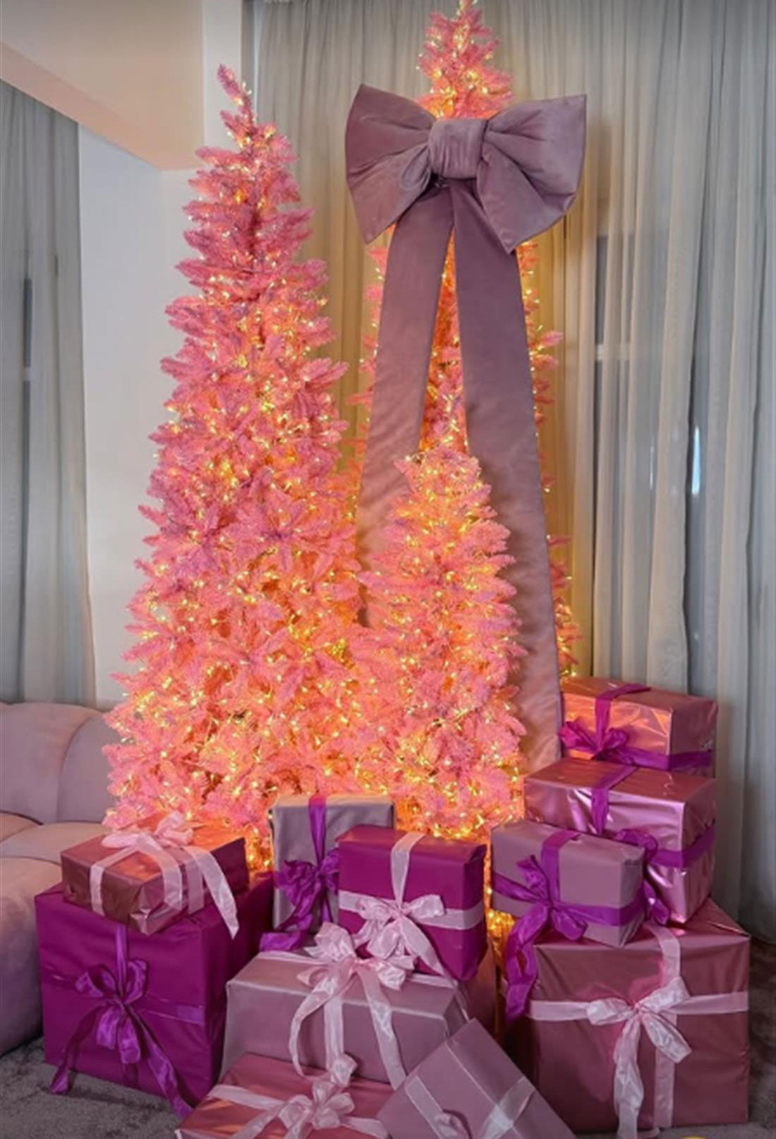 Τα τρία δέντρα που τοποθέτησε στο σαλόνι της ήταν σε total pink διάθεση: στολισμένα όχι με κλασικές μπάλες, αλλά με εκατοντάδες λαμπάκια που δημιουργούσαν μια ομοιόμορφη, φωτεινή λάμψη.