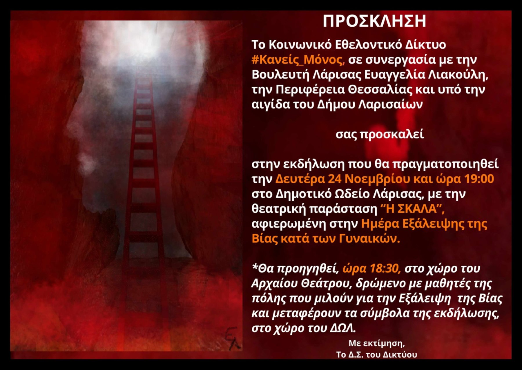 Πυρετώδεις οι προετοιμασίες, οι οποίες πλέον βρίσκονται στην τελική ευθεία, μιας πρωτότυπης εκδήλωσης, η οποία, όπως ήδη είχε ανακοινωθεί από το Δίκτυο, θα πραγματοποιηθεί στη Λάρισα τη Δευτέρα 24 Νοεμβρίου και ώρα 19:00 στο Δημοτικό Ωδείο της πόλης και περιλαμβάνει σειρά δράσεων, με κεντρικό θέμα τη θεατρική παράσταση με τίτλο «Η ΣΚΑΛΑ» και με ελεύθερη είσοδο για τους συμπολίτες .