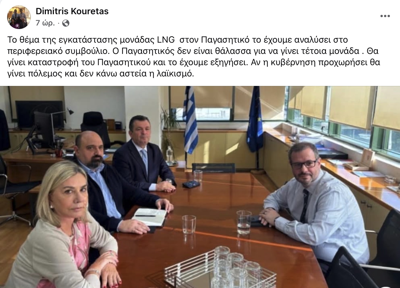 Ο Δημήτρης Κουρέτας δείχνει να ανεβάζει κατακόρυφα τους τόνους απέναντι στο σχέδιο για το LNG στον Παγασητικό, παρουσιάζοντας το θέμα όχι ως τεχνική ή περιβαλλοντική διαφωνία, αλλά ως γραμμή άμυνας απέναντι σε μια… εισβολή.