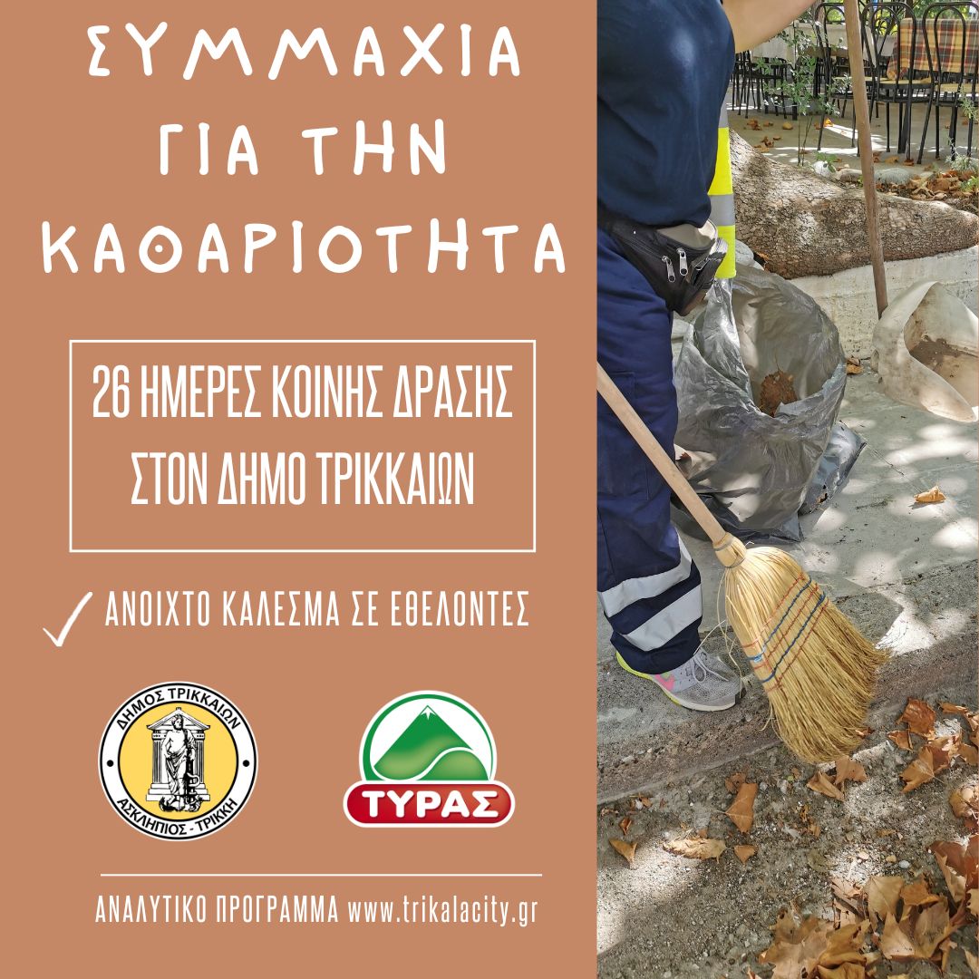 Με γενικό σύνθημα «Καθαρίζουμε – Προσφέρουμε – Ομορφαίνουμε», η δράση απευθύνεται και σε όλους τους πολίτες. Στόχος, ο μέγιστος δυνατός ευπρεπισμός της πόλης, η καθαρή γειτονιά, το όμορφο περιβάλλον. Η κοινή αυτή δράση αποτελεί συνέχεια παλαιότερης συνεργασίας του Δήμου Τρικκαίων με την τρικαλινή εταιρεία ΤΥΡΑΣ, με καθαρισμό κόμβων σε κεντρικά σημεία εισόδων – εξόδων από τα Τρίκαλα.