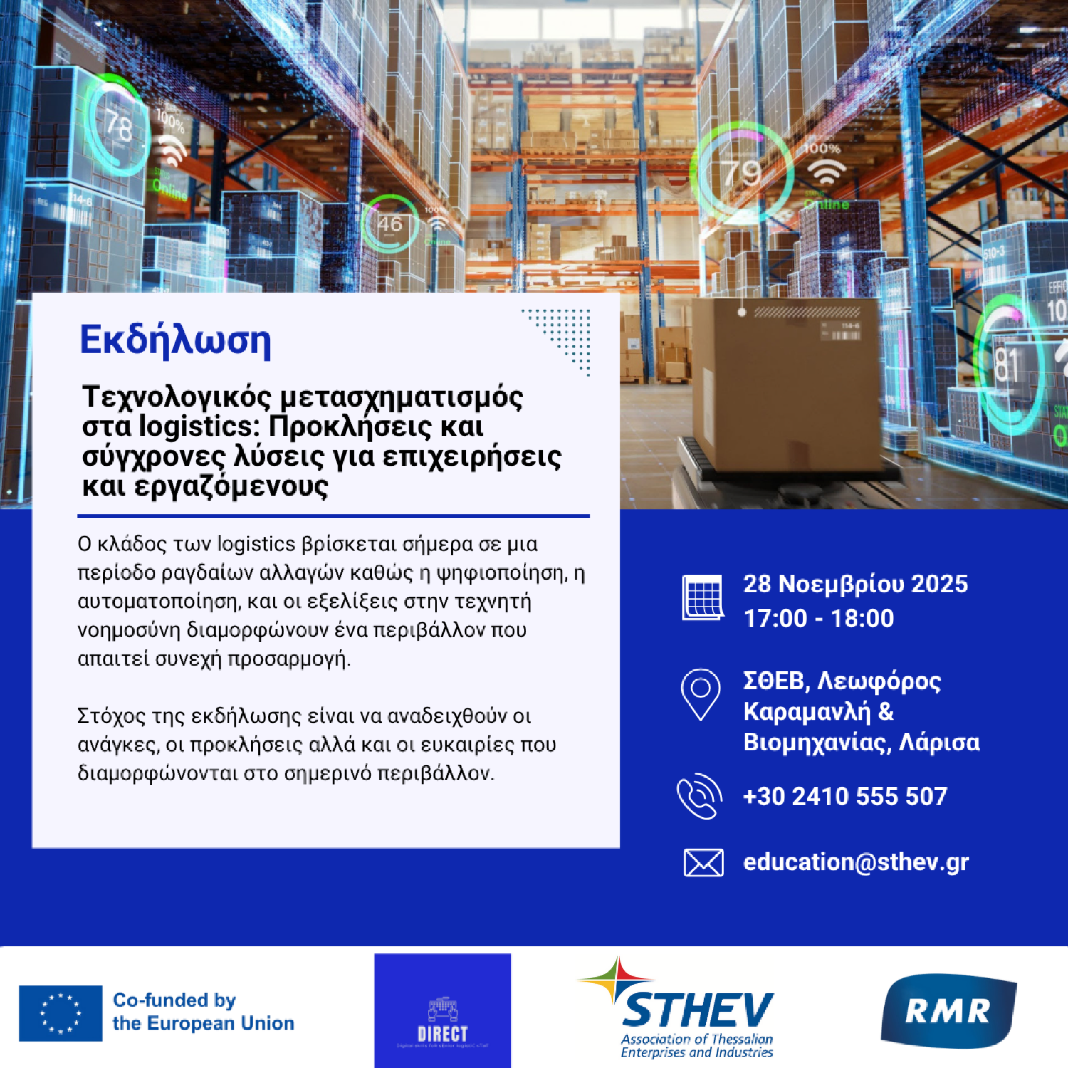 Με στόχο να αναδειχθούν οι ανάγκες, οι προκλήσεις αλλά και οι ευκαιρίες που διαμορφώνονται στο σημερινό περιβάλλον, ο ΣΘΕΒ διοργανώνει εκδήλωση με θέμα: «Τεχνολογικός μετασχηματισμός στα logistics: Προκλήσεις και σύγχρονες λύσεις για επιχειρήσεις και εργαζόμενους» την Παρασκευή 28 Νοεμβρίου, 17:00 – 18:00 στις εγκαταστάσεις του (Λ. Καραμανλή & Βιομηχανίας)