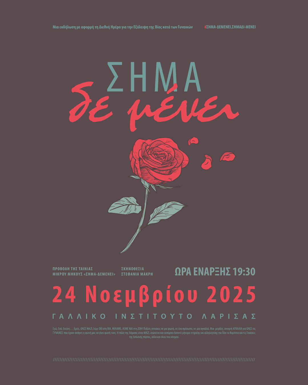 Δράση με αφορμή την Παγκόσμια Ημέρα Εξάλειψης της Βίας κατα των Γυναικών αναμένεται να λάβει χώρα την ερχόμενη Δευτέρα στο Γαλλικό Ινστιτούτο Λάρισας.