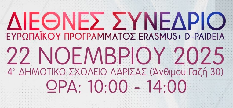 H Διεύθυνση Πρωτοβάθμιας Εκπαίδευσης Λάρισας, διοργανώνει Διεθνές Συνέδριο «D-PAIDEIA», το οποίο θα πραγματοποιηθεί στο 4ο Δημοτικό Σχολείο Λάρισας (Άνθιμου Γαζή 30), το Σάββατο 22/11/2025, και ώρα 10:00-14:00, σε συνεργασία με τον οργανισμό Action Synergy, ο οποίος αποτελεί τον συντονιστή φορέα του Ευρωπαϊκού Προγράμματος Erasmus+ D-PAIDEIA.