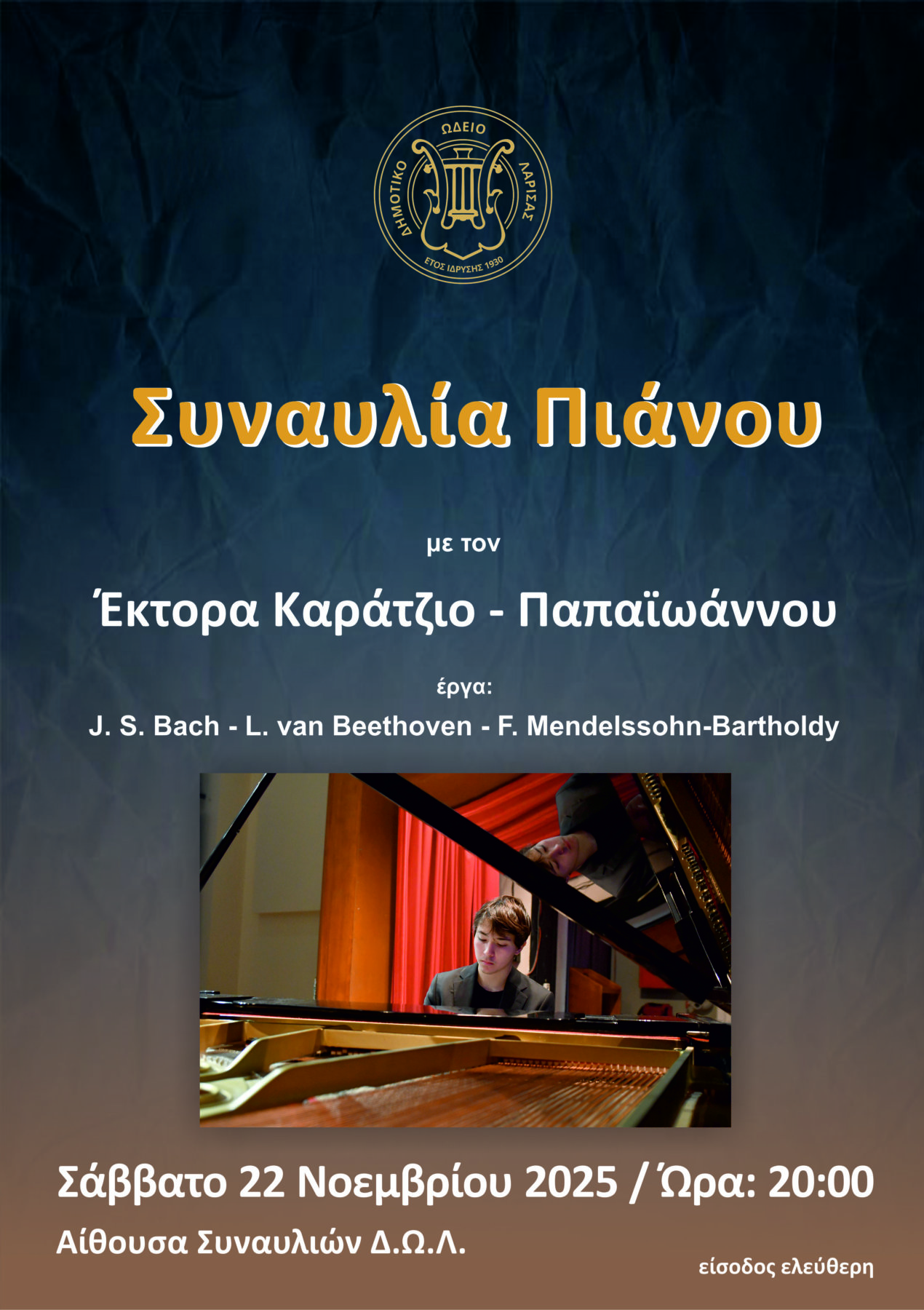 Ένας από τους πιο ξεχωριστούς νέους πιανίστες που ανέδειξε το Δημοτικό Ωδείο Λάρισας επιστρέφει στη γενέτειρά του για μια βραδιά γεμάτη δεξιοτεχνία και έμπνευση. Ο δεκαεννιάχρονος Έκτορας Καράτζιος-Παπαϊωάννου, από τα μεγαλύτερα ταλέντα που έχουν περάσει από τις αίθουσες του Δ.Ω.Λ., έρχεται στη Λάρισα για να παρουσιάσει ένα πρόγραμμα υψηλών απαιτήσεων, με έργα που αναδεικνύουν τόσο τη μουσικότητα όσο και την πνευματική του ωριμότητα.