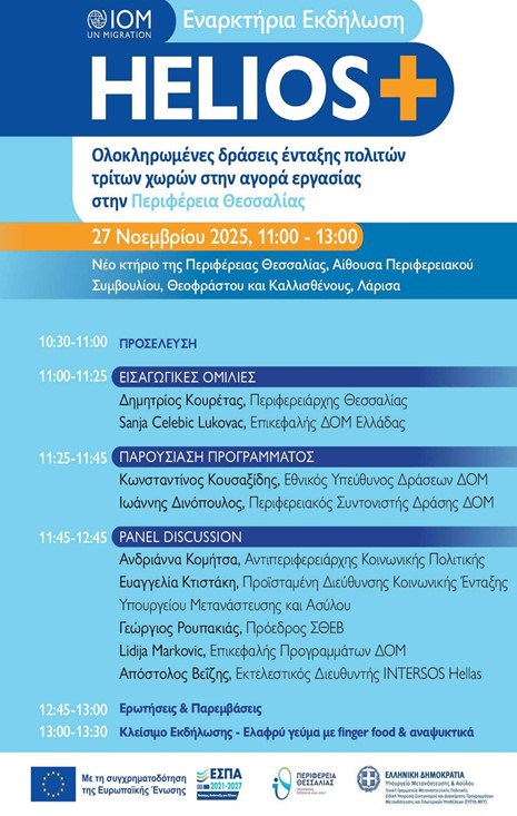 Η Περιφέρεια Θεσσαλίας και ο Διεθνής Οργανισμός Μετανάστευσης (IOM) διοργανώνουν την Εναρκτήρια Εκδήλωση του προγράμματος HELIOS+, με αντικείμενο τις Ολοκληρωμένες δράσεις ένταξης πολιτών τρίτων χωρών στην αγορά εργασίας στην Περιφέρεια Θεσσαλίας.