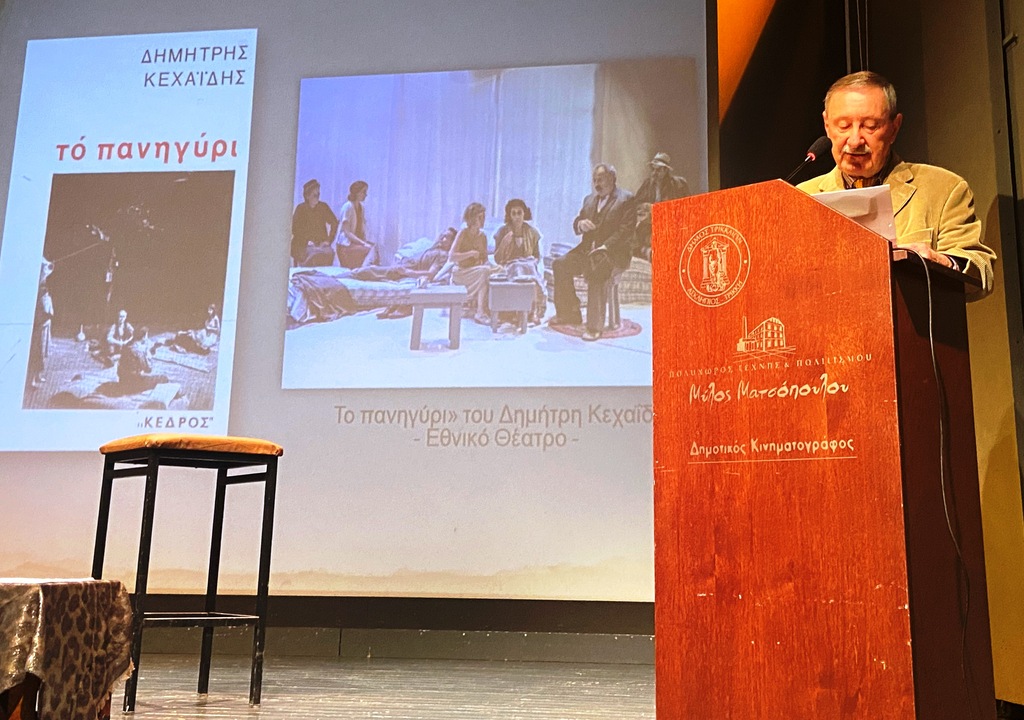 Τέλος, ο ποιητής Ηλίας Κεφάλας μίλησε για το εμβληματικό έργο «Το Πανηγύρι», που αναφέρεται στα πανηγύρια του θεσσαλικού κάμπου. Είναι ένα έργο που καθιέρωσε τον Κεχαΐδη στα θεατρικά δρώμενα ως έναν από τους σημαντικότερους συγγραφείς του 20ού αιώνα.
