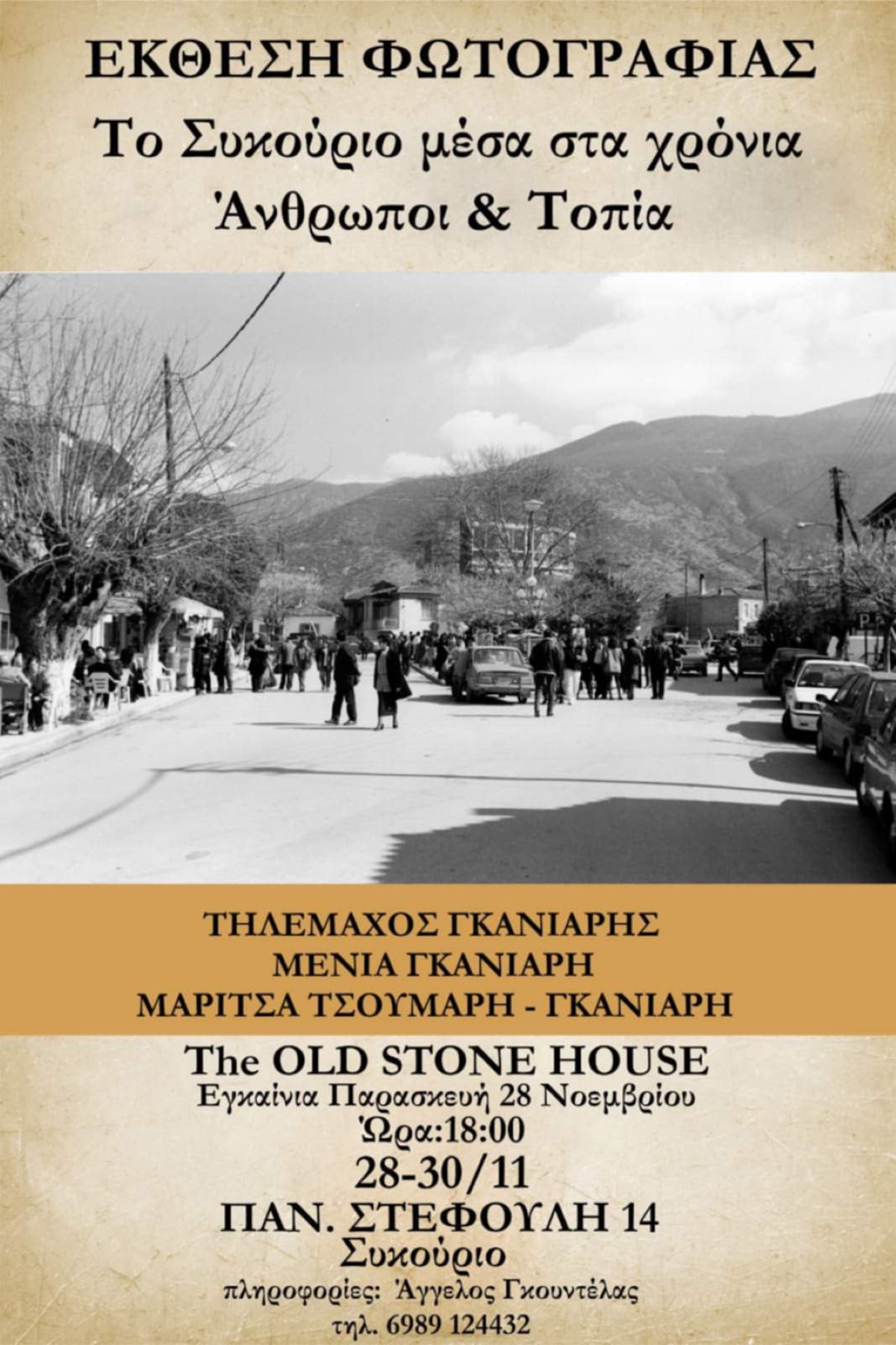 Τα εγκαίνια της έκθεσης «Το Συκούριο μέσα στα χρόνια : Άνθρωποι και τοπία »η αναμένεται να λάβουν χώρα στον ομώνυμο τόπο και στο Old Stone House, την ερχόμενη Παρασκευή 28 Νοεμβρίου.