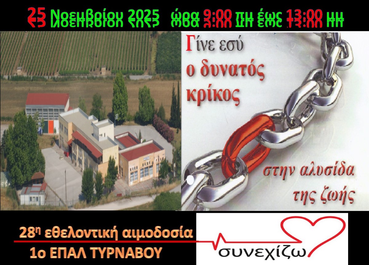 Την Τρίτη, 25 Νοεμβρίου 2025, θα πραγματοποιηθεί στο 1ο ΕΠΑΛ Τυρνάβου, σε συνεργασία με το τμήμα αιμοδοσίας του Γενικού Νοσοκομείου Λάρισας, η 28η συνολική εθελοντική αιμοδοσία.