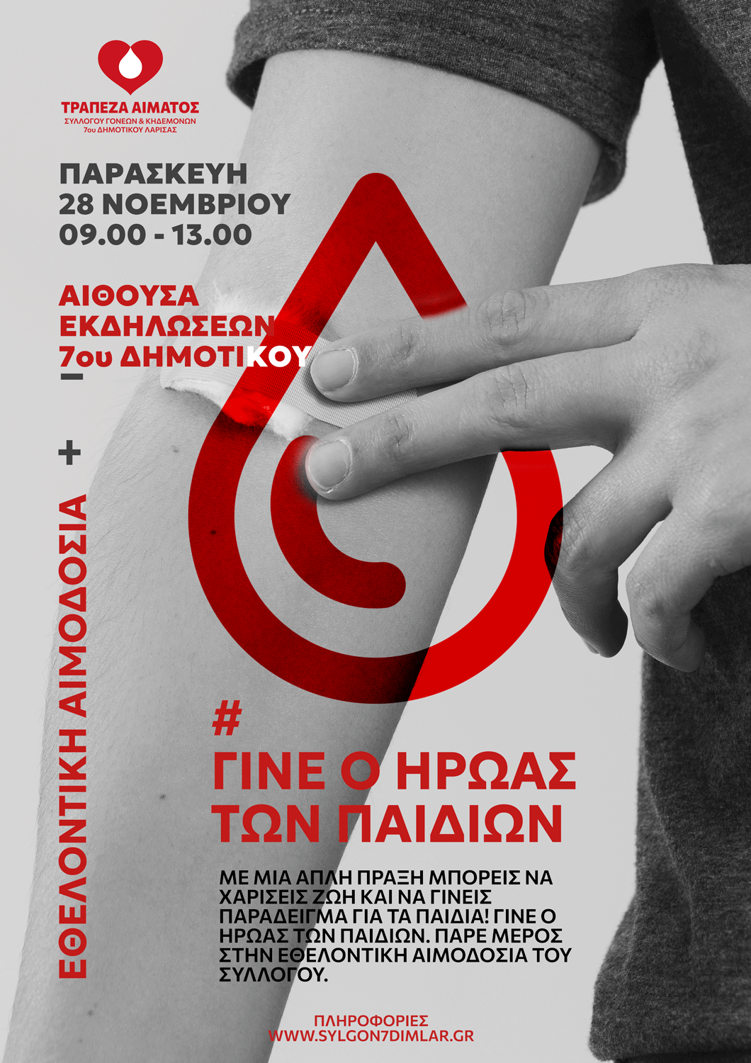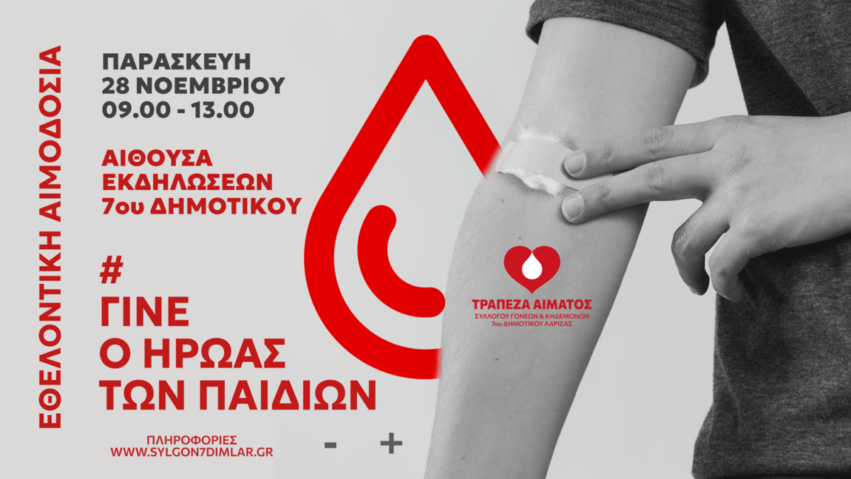 Ο Σύλλογος Γονέων και Κηδεμόνων του 7ου Δημοτικού Σχολείου Λάρισας ανακοινώνει με ιδιαίτερη χαρά τη διοργάνωση της 2ης Εθελοντικής Αιμοδοσίας του Συλλόγου, η οποία θα πραγματοποιηθεί την Παρασκευή 28 Νοεμβρίου 2025, στην αίθουσα εκδηλώσεων του σχολείου (Κουμουνδούρου 53 – Είσοδος από Αριστοτέλους), από τις 09:00 έως τις 13:00.