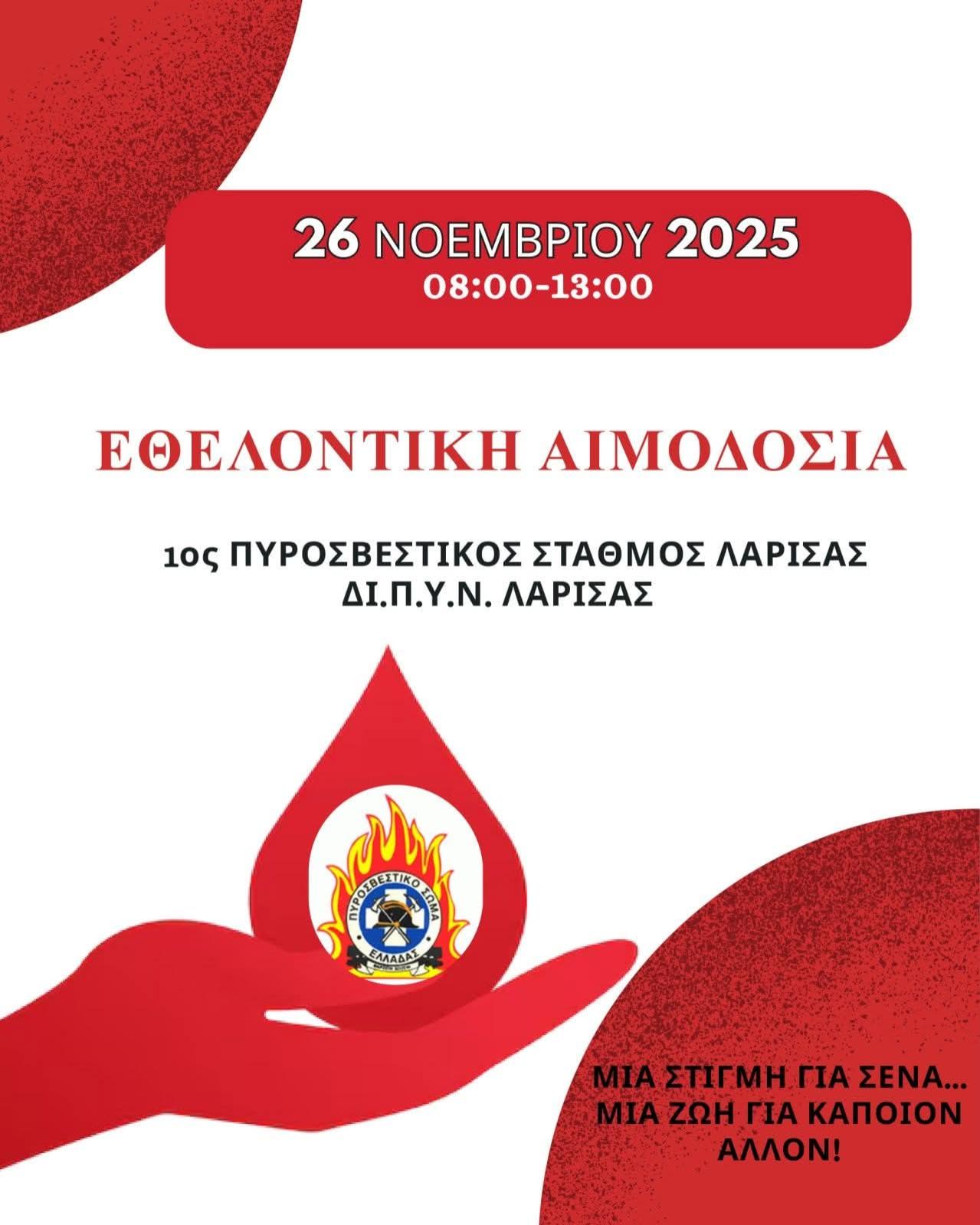 Εθελοντική μέρα αιμοδοσίας διοργανώνει ο 1ος Πυροσβεστικός Σταθμός Λάρισας την Τετάρτη 26 Νοεμβρίου 2025 και ώρα 08:00 με 13:00 στις εγκαταστάσεις του 1ου Π.Σ Λάρισας (Ιωαννίνων 96).
