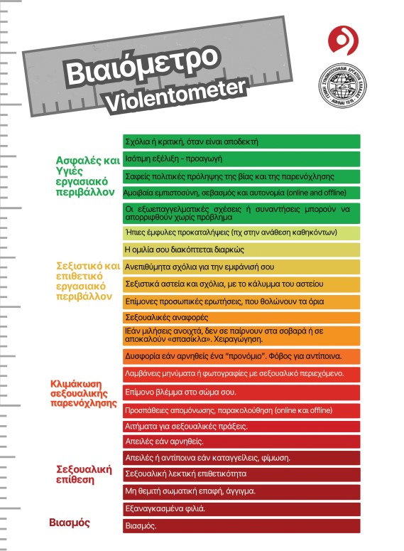 √ δίνουμε στη δημοσιότητα το «Βιαιόμετρο» (Violentometer), ένα δυναμικό εργαλείο που σχεδιάστηκε συμμετοχικά από τη Συνομοσπονδία Ευρωπαϊκών Συνδικάτων (ETUC), για να βοηθά στον έγκαιρο εντοπισμό και την κατάλληλη αντιμετώπιση της βίας και της παρενόχλησης λόγω φύλου στον χώρο εργασίας. Με την αυτονόητη εξήγηση ότι βία είναι μία και δεν χρειάζεται μέτρηση, ωστόσο οι συμπεριφορές ή/και οι ενδείξεις βίας που περιέχονται στην αποτύπωση αυτή διευκολύνουν την κατανόηση της κλιμάκωσης, όχι απαραίτητα σε απόλυτη συνέχεια, από τις ουδέτερες απευθύνσεις, οι οποίες μπορούν να συνυπάρχουν ή να ακολουθούνται από προκαταλήψεις ή φαινομενικά ήσσονος σημασίας συμπεριφορές που, αν αφεθούν χωρίς αντίδραση και έλεγχο, μπορούν να εξελιχθούν σε σοβαρές μορφές παραβιάσεων, συμπεριλαμβανομένης της σεξουαλικής επίθεσης. Το εργαλείο αυτό θα συμβάλει στην έγκαιρη, ευκταία, αναγνώριση και αντιμετώπιση παρενοχλητικών ή βίαιων συμπεριφορών/πράξεων στο εργασιακό περιβάλλον (φυσικό και ψηφιακό) και θα ενισχύσει τον δίαυλο επικοινωνίας των θυμάτων με τα εργατικά σωματεία για την αποτελεσματική προστασία τους και την κατάλληλη τιμωρία των δραστών
