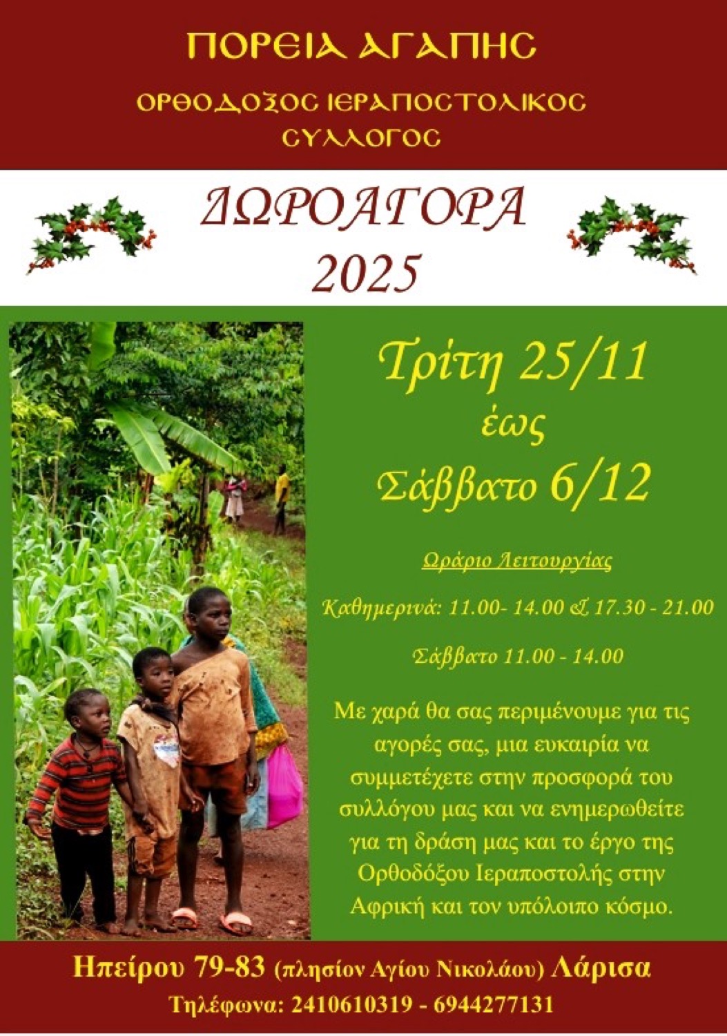 Από αύριο (Τρίτη, 25 Νοεμβρίου 2025 έως και 6 Δεκεμβρίου) στην αίθουσα Κατηχητικών συνάξεων της Πορείας Αγάπης,του Ορθοδόξου Ιεραποστολικού Συλλόγου που εδρεύει στη Λάρισα